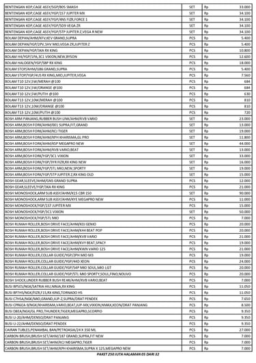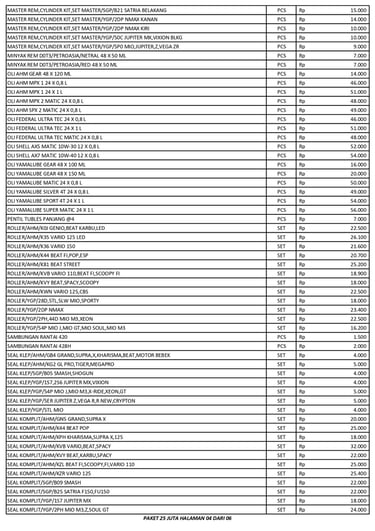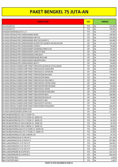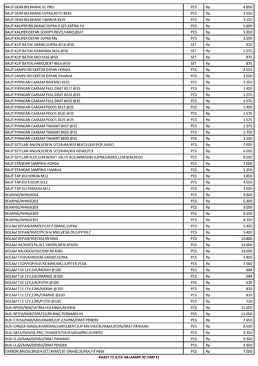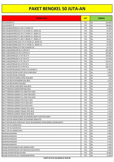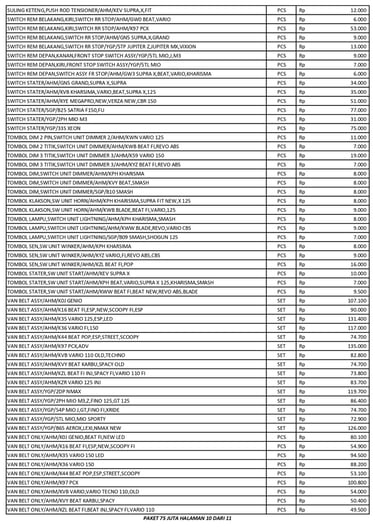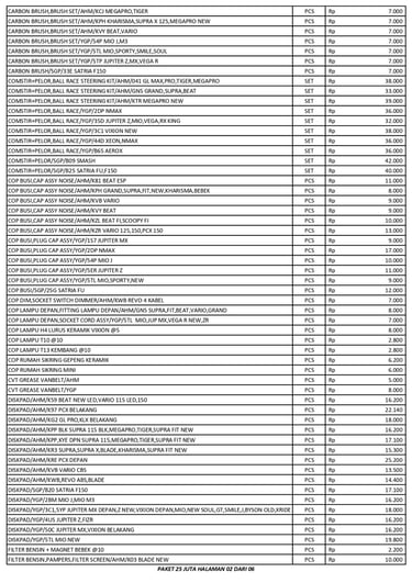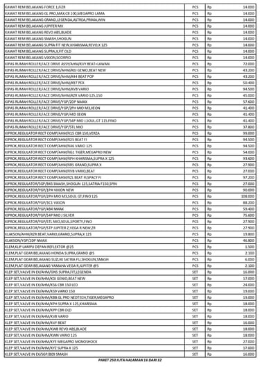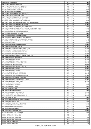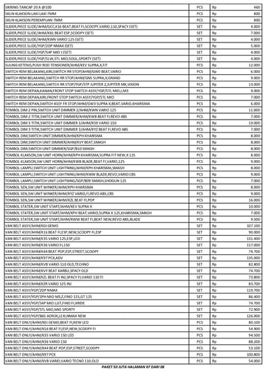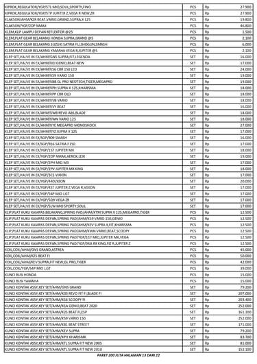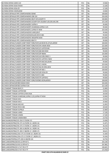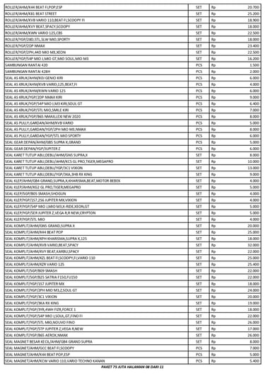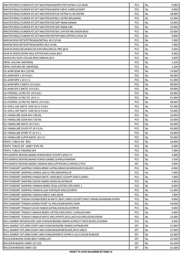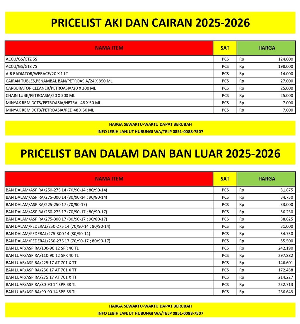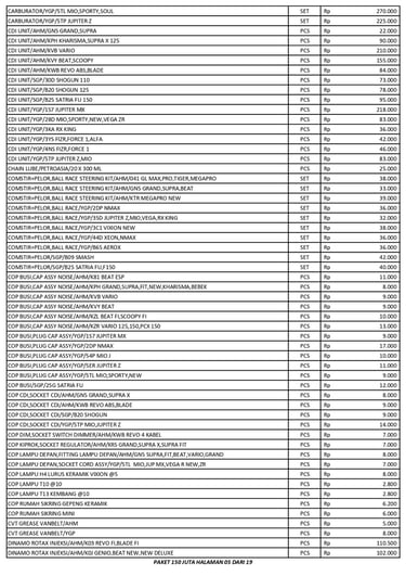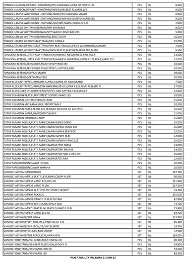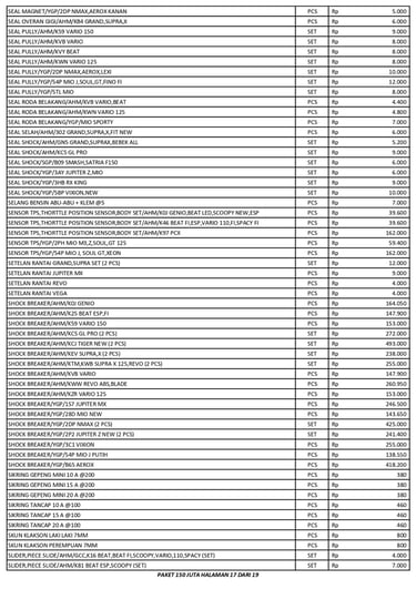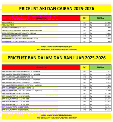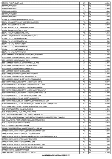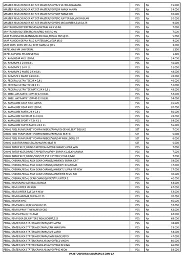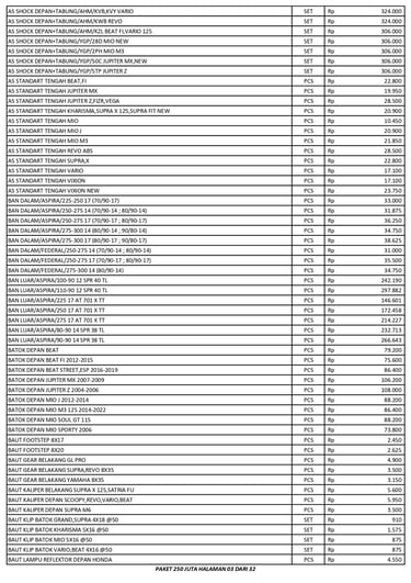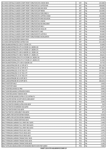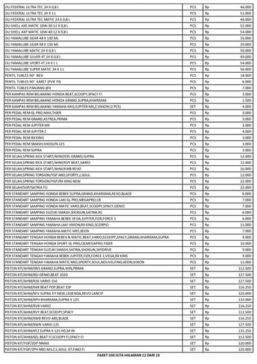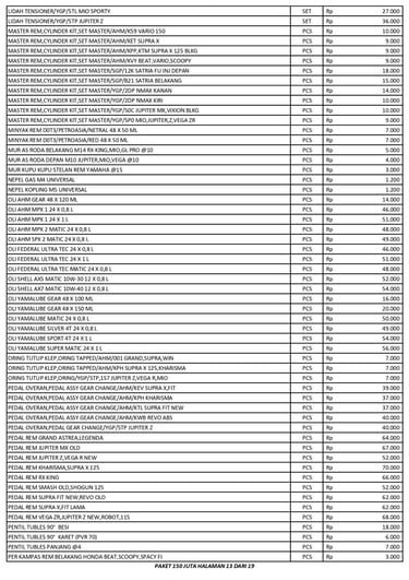 PRICELIST SPAREPART, BAN LUAR, BAN DALAM, DAN OLI