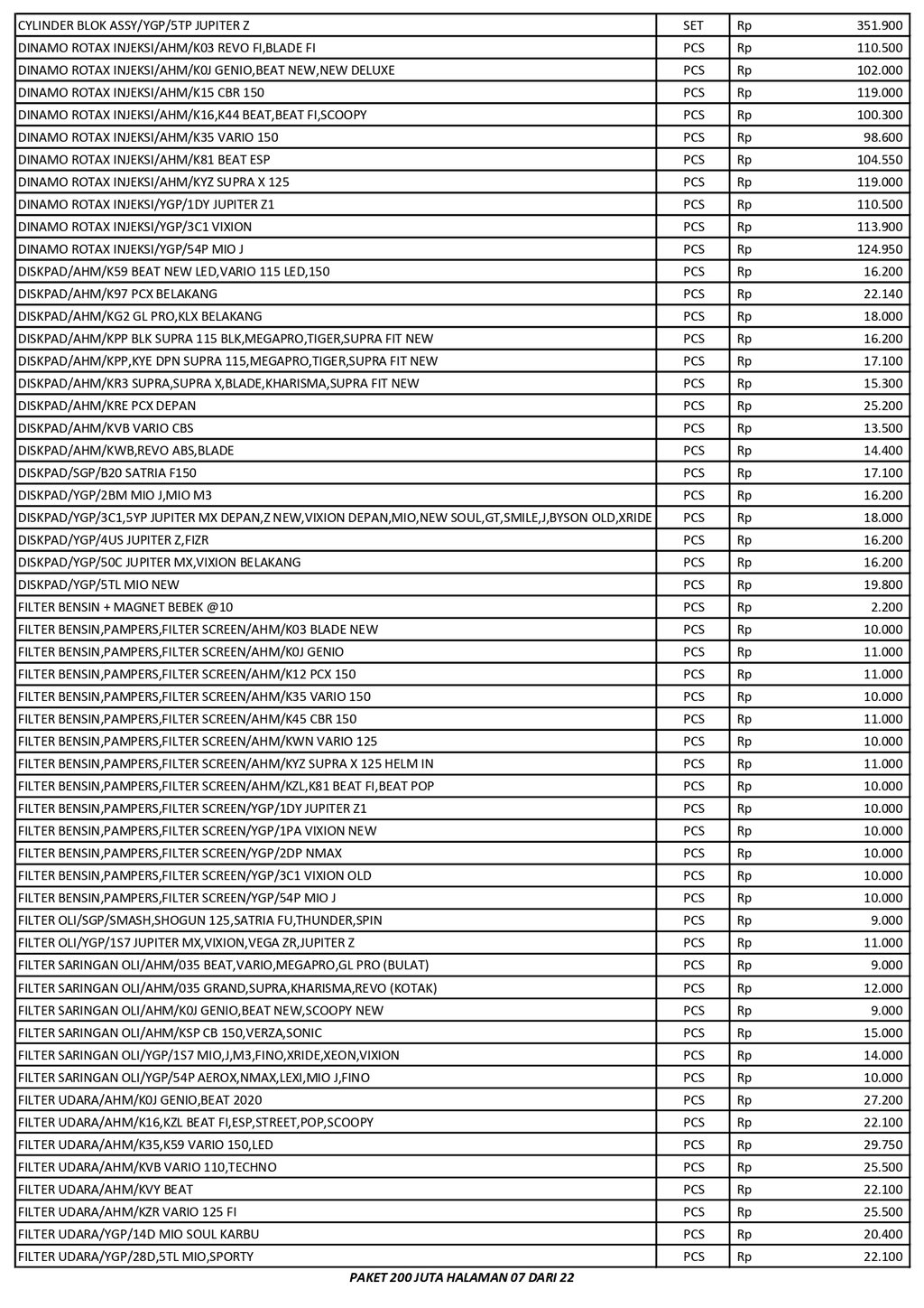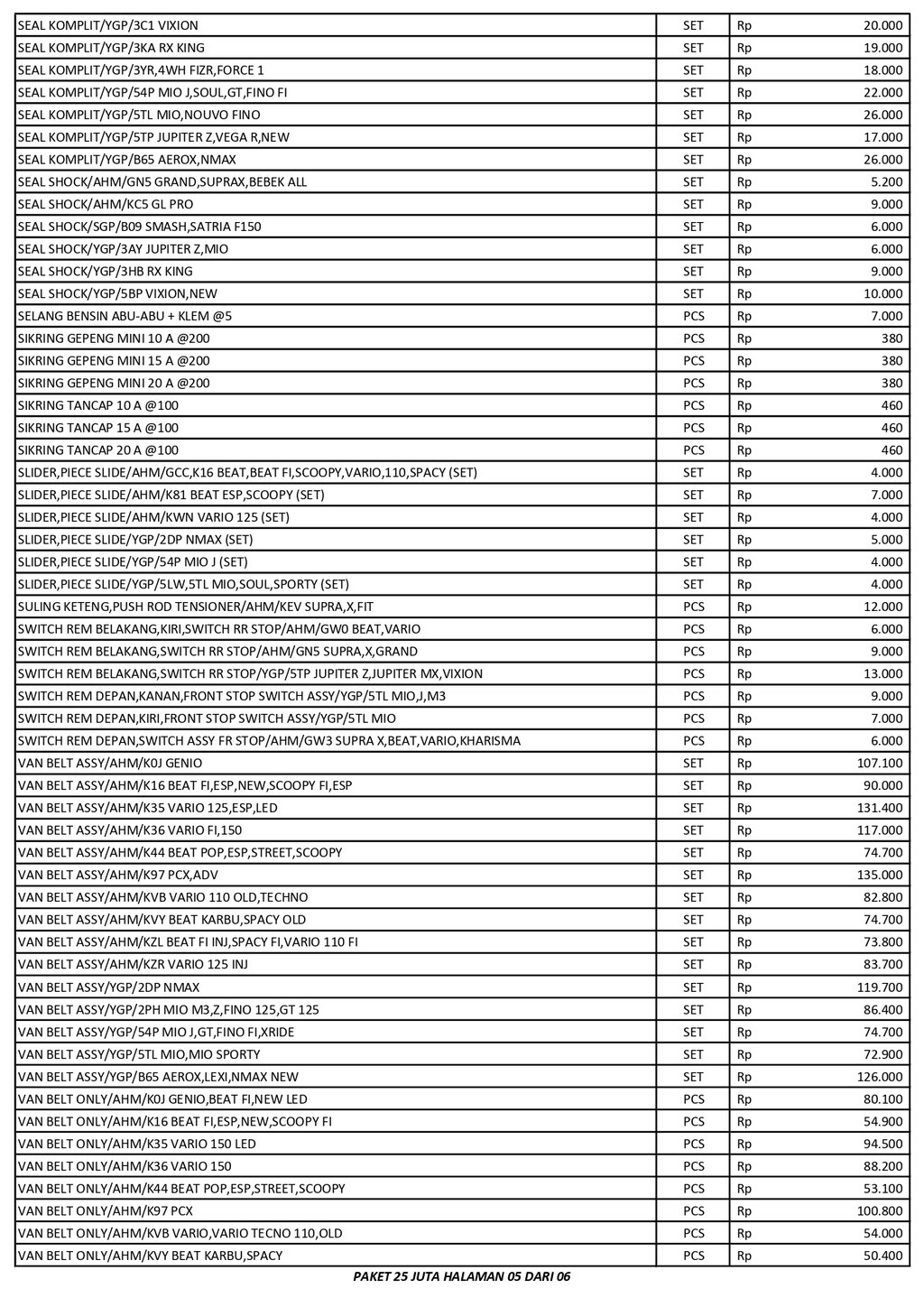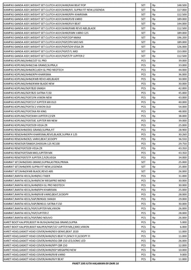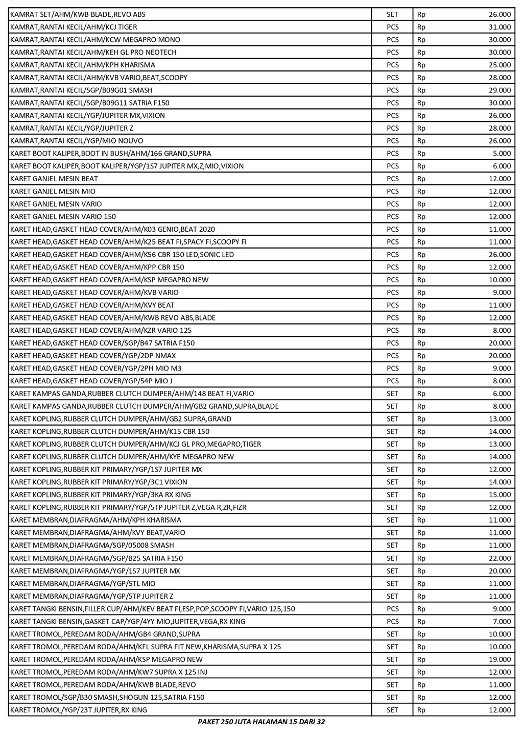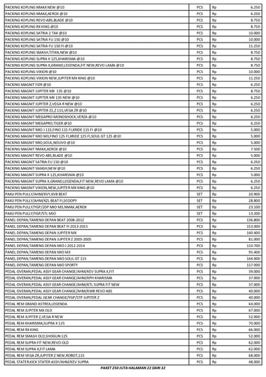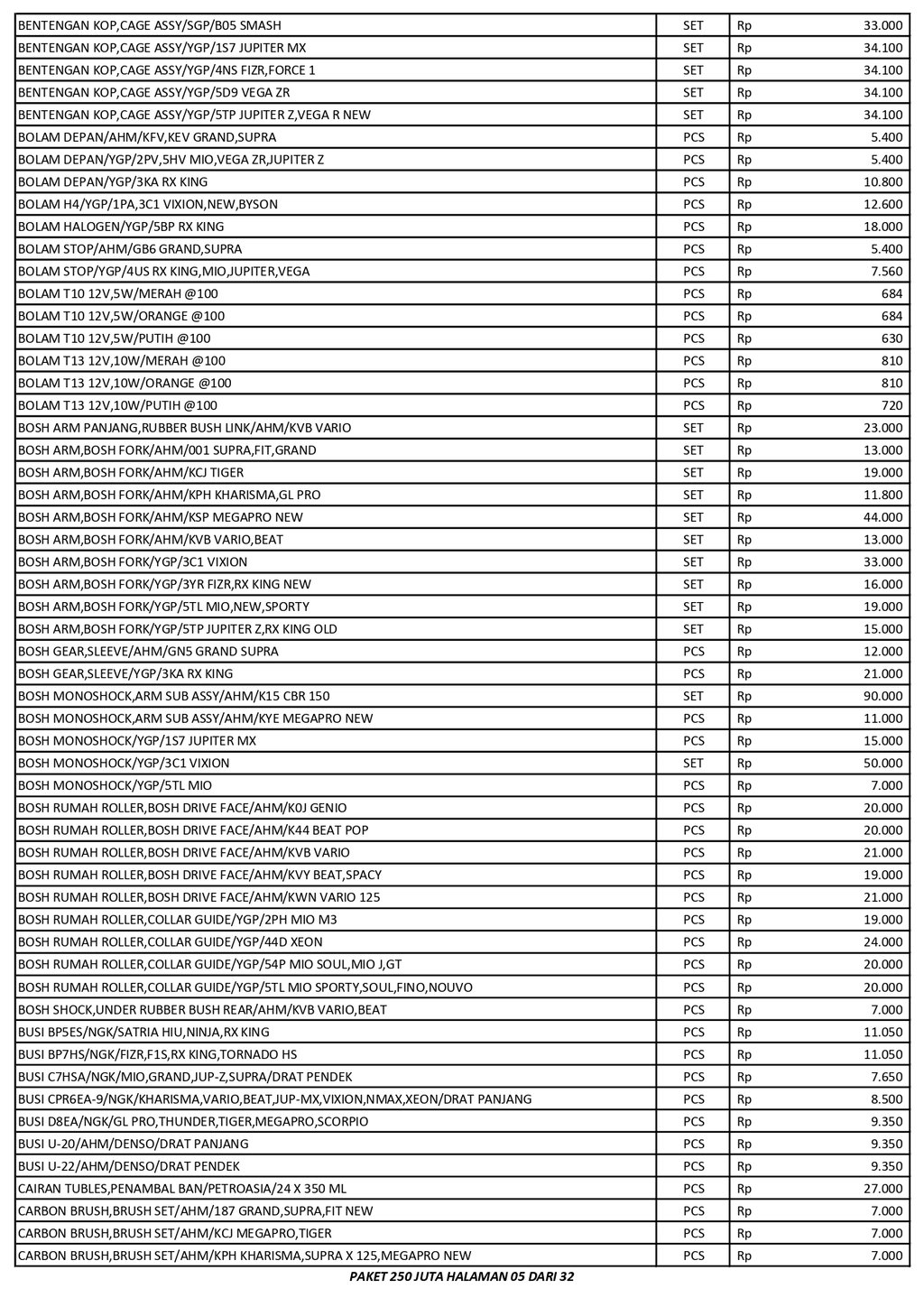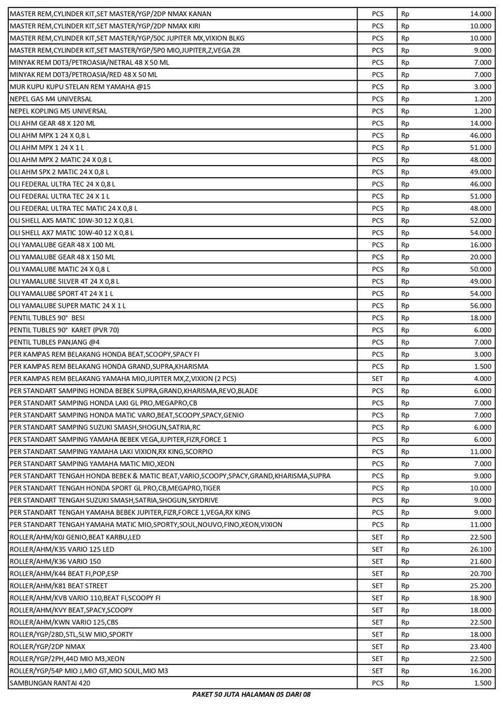 PRICELIST SPAREPART, BAN LUAR, BAN DALAM, DAN OLI