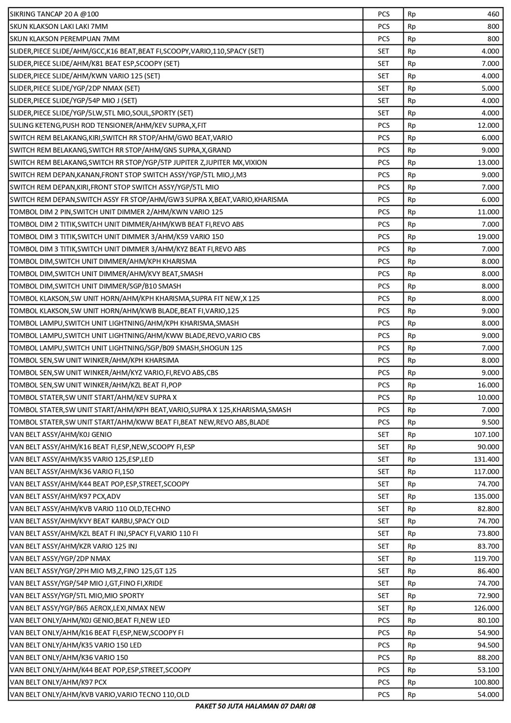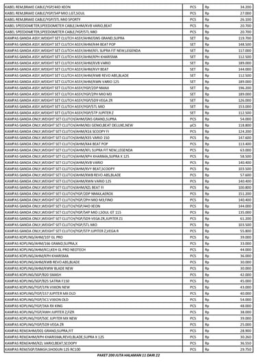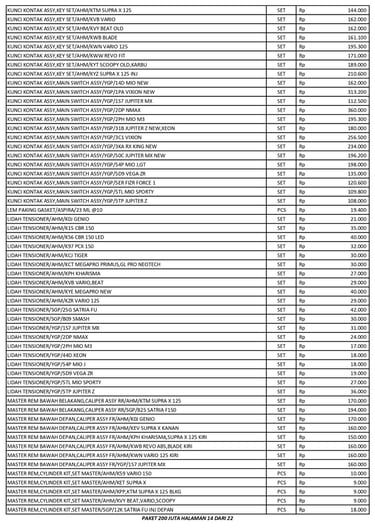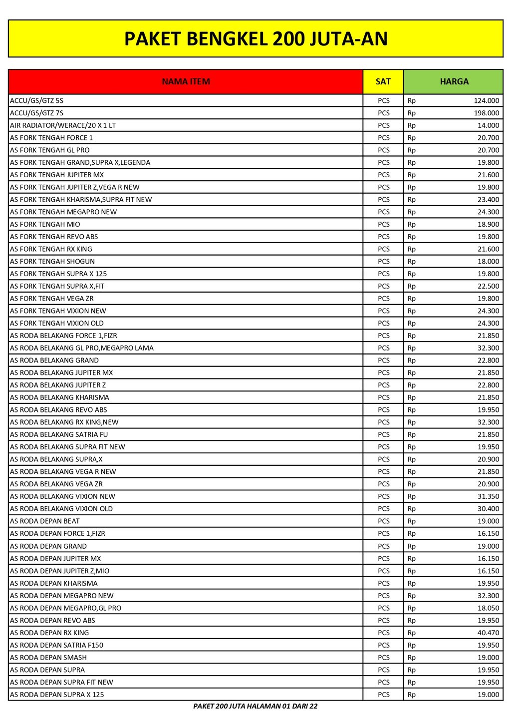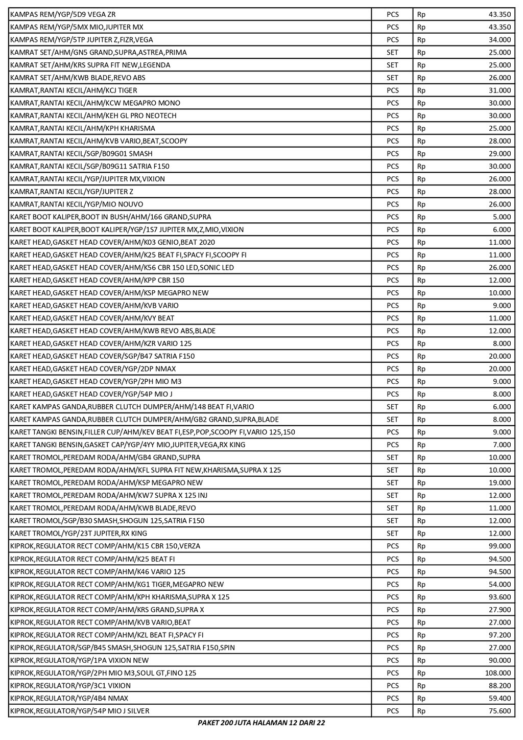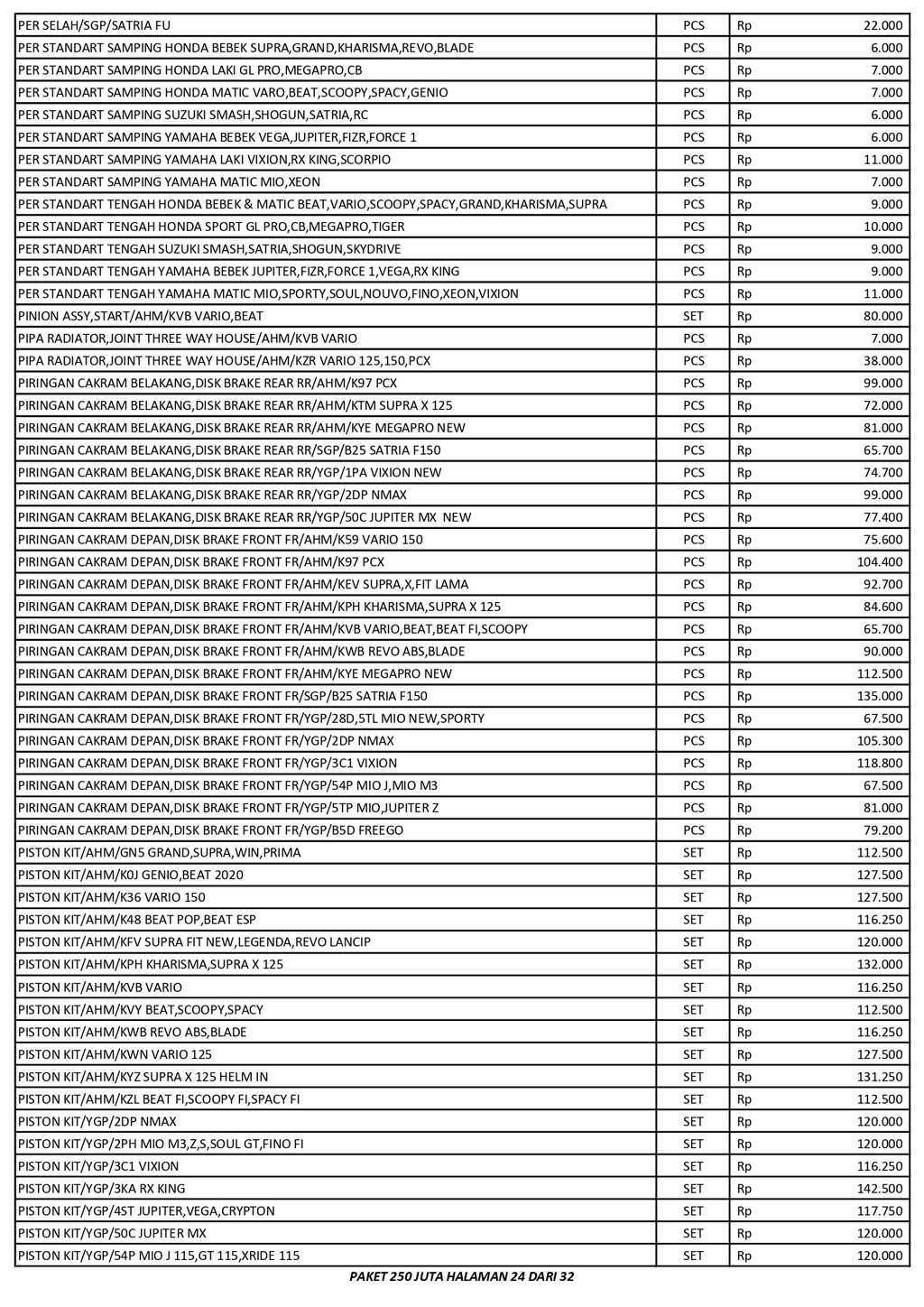 PRICELIST SPAREPART, BAN LUAR, BAN DALAM, DAN OLI