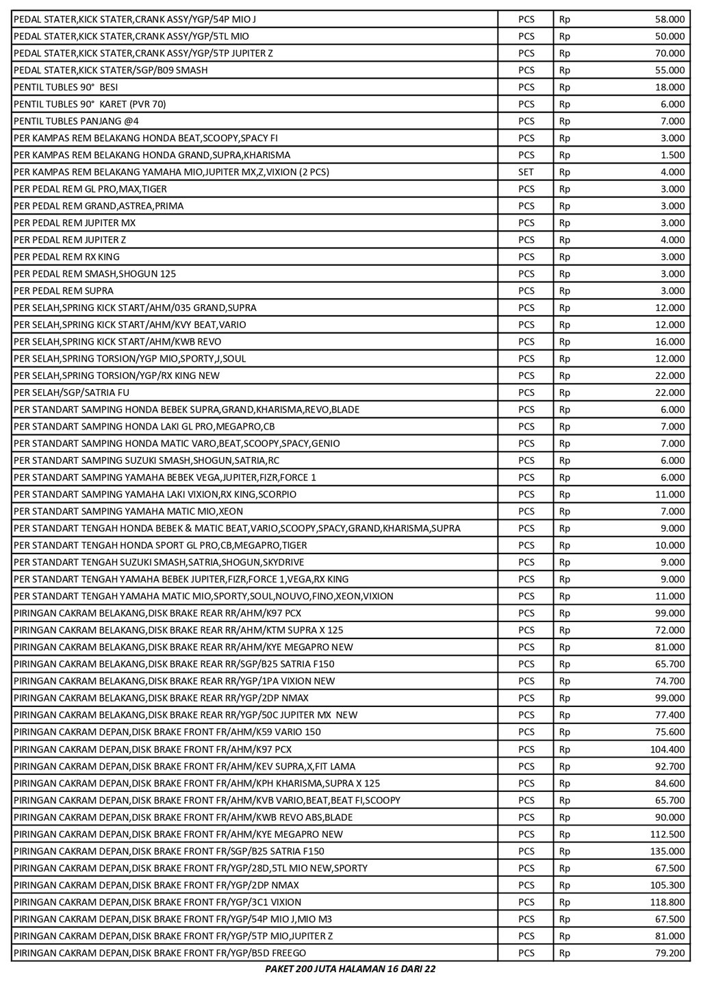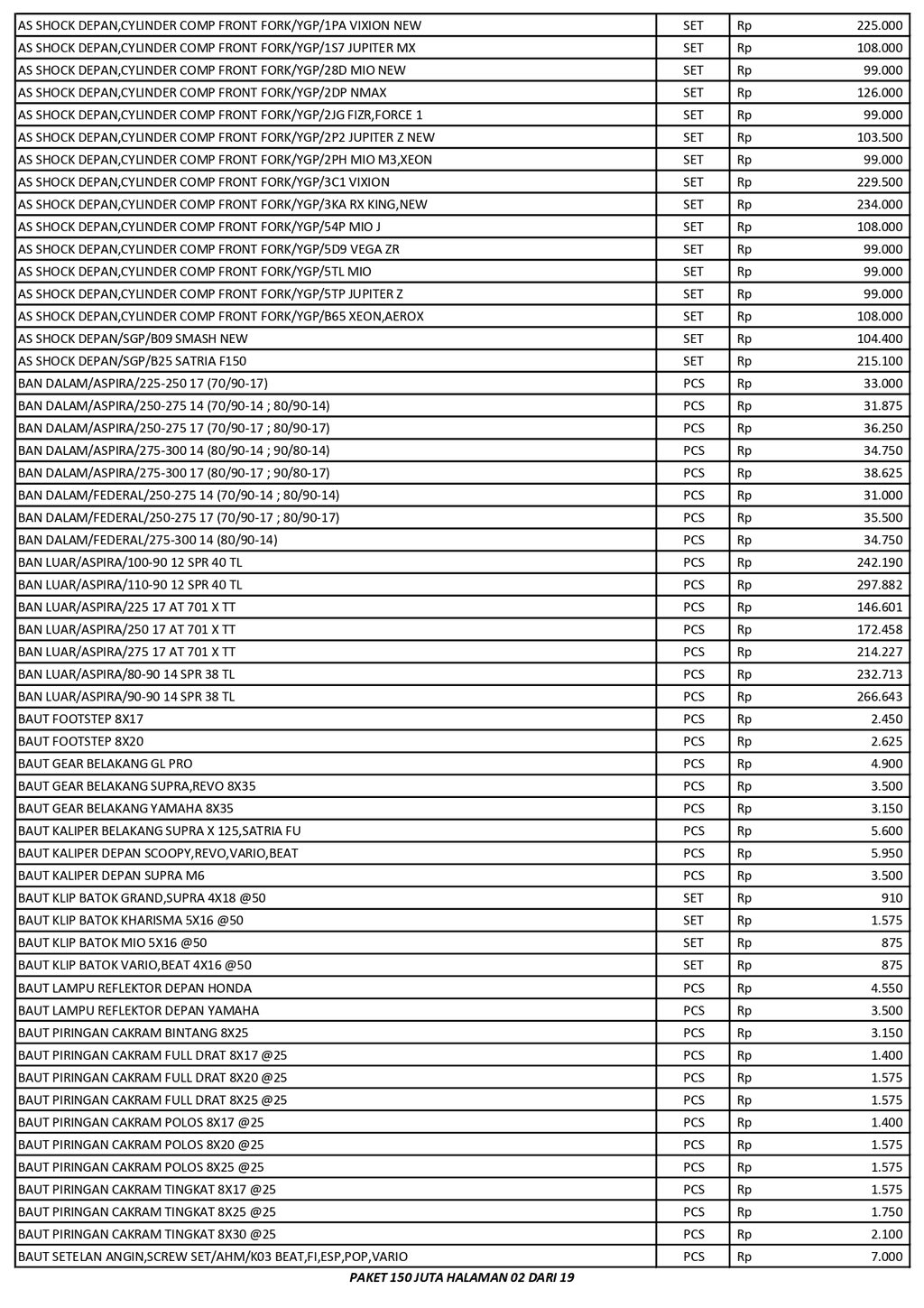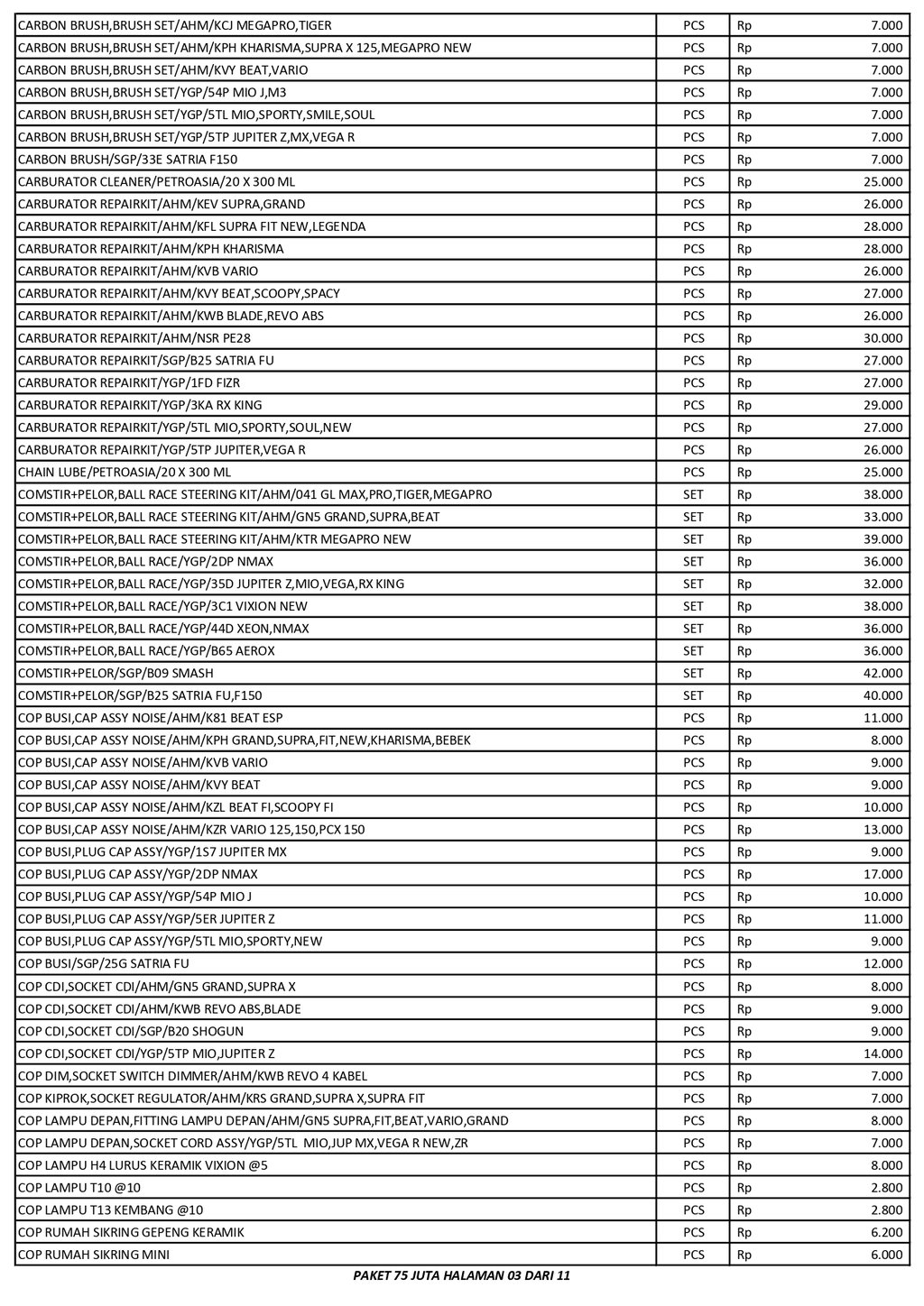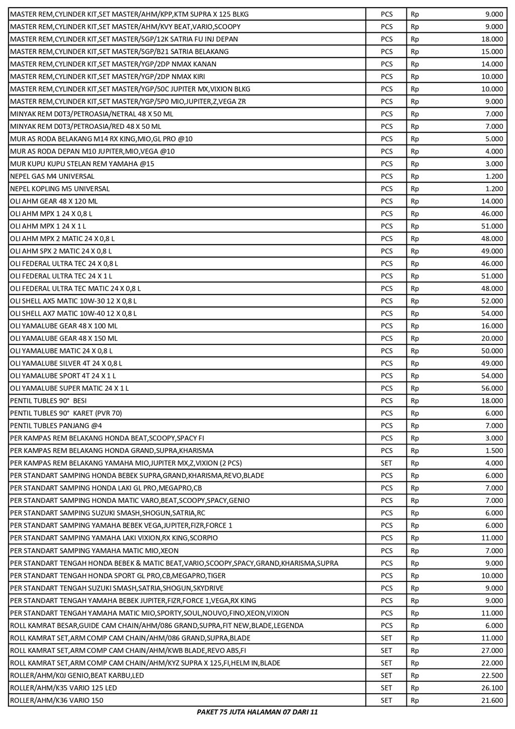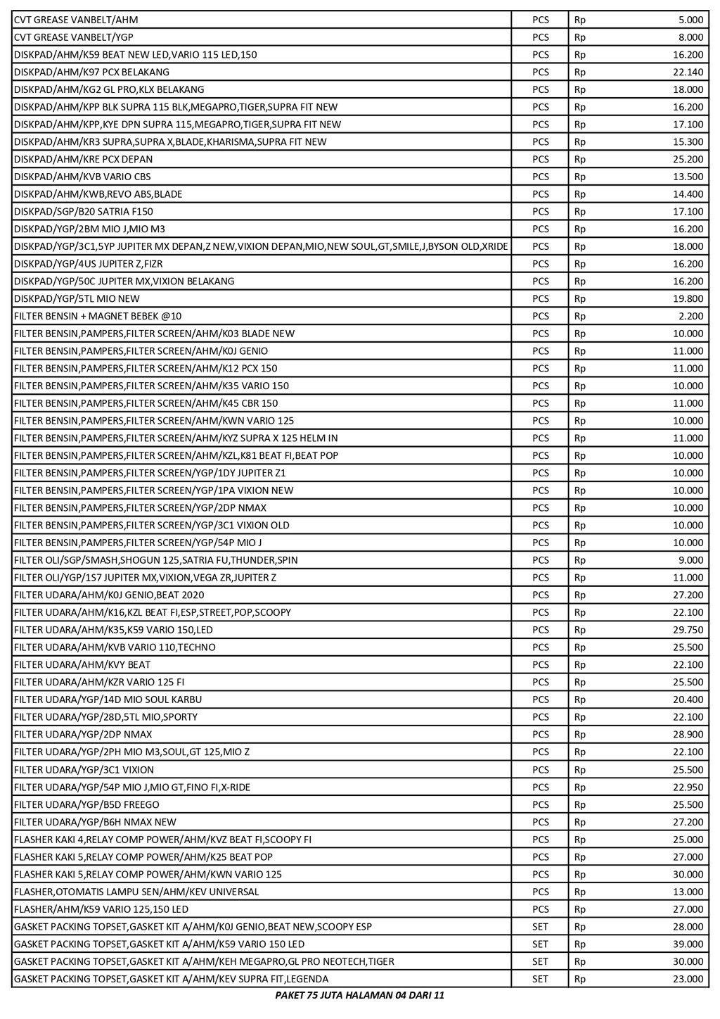 PRICELIST SPAREPART, BAN LUAR, BAN DALAM, DAN OLI