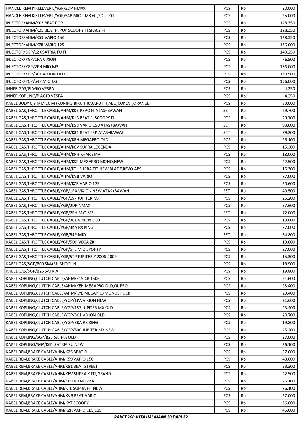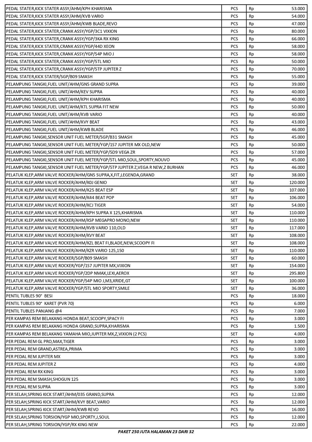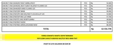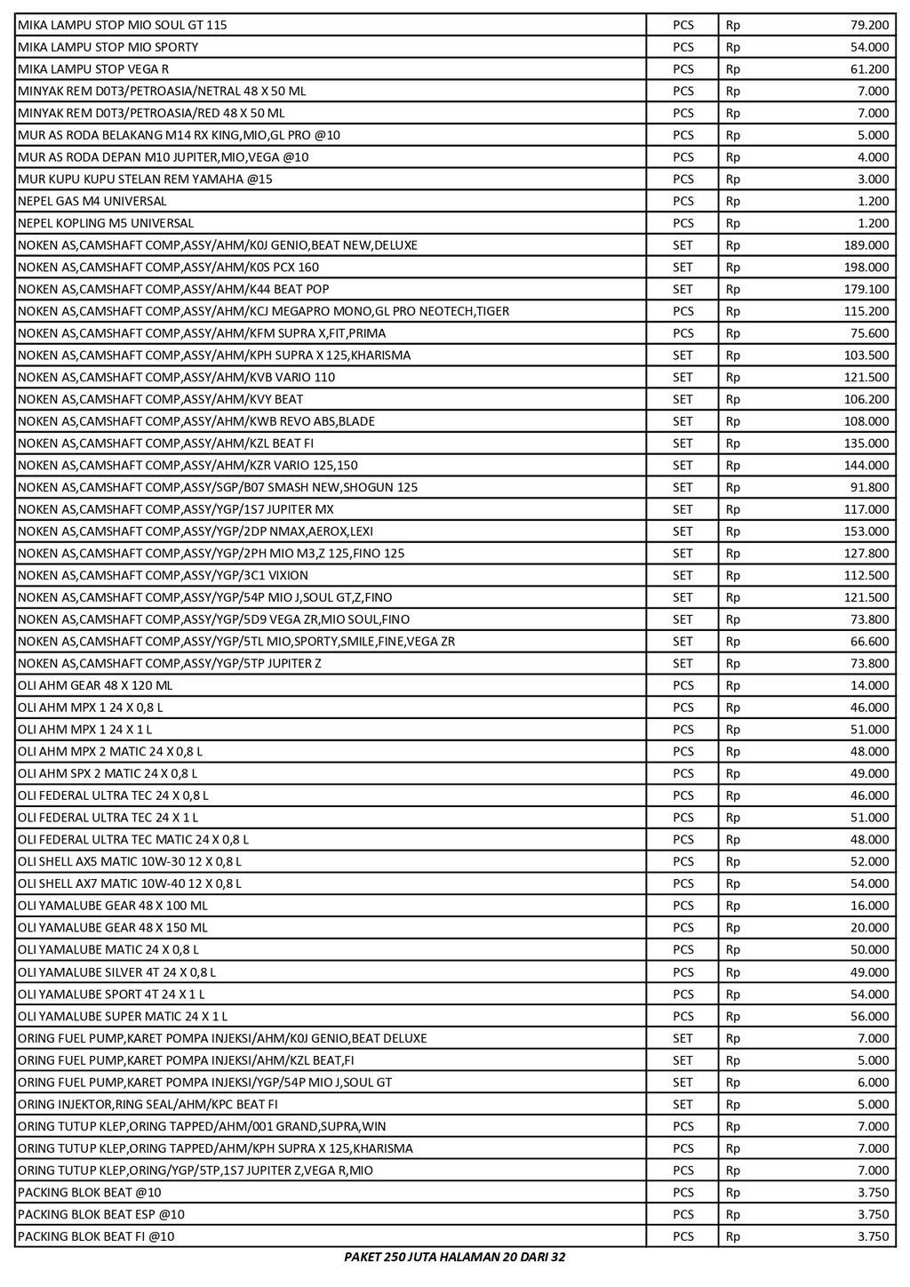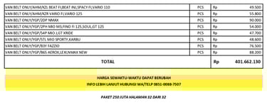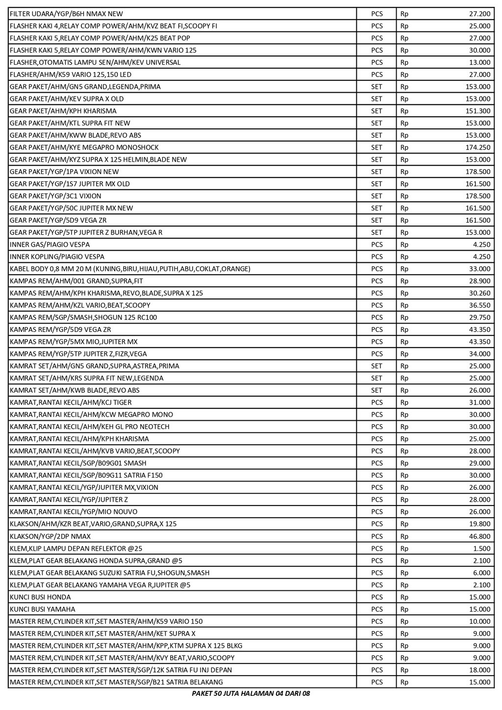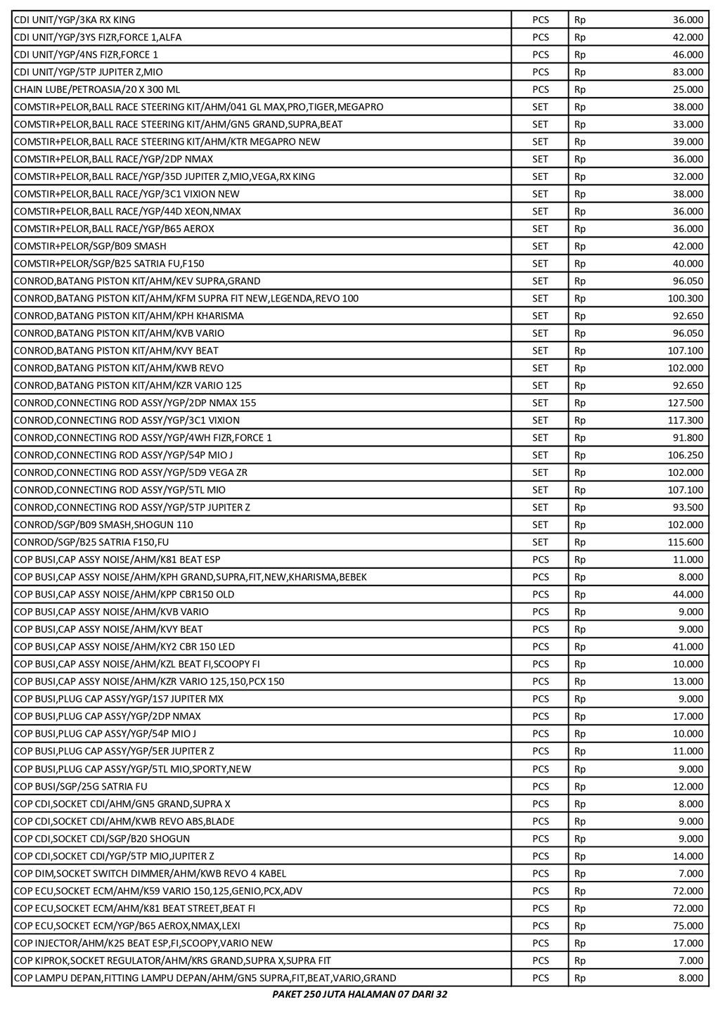PRICELIST SPAREPART, BAN LUAR, BAN DALAM, DAN OLI
