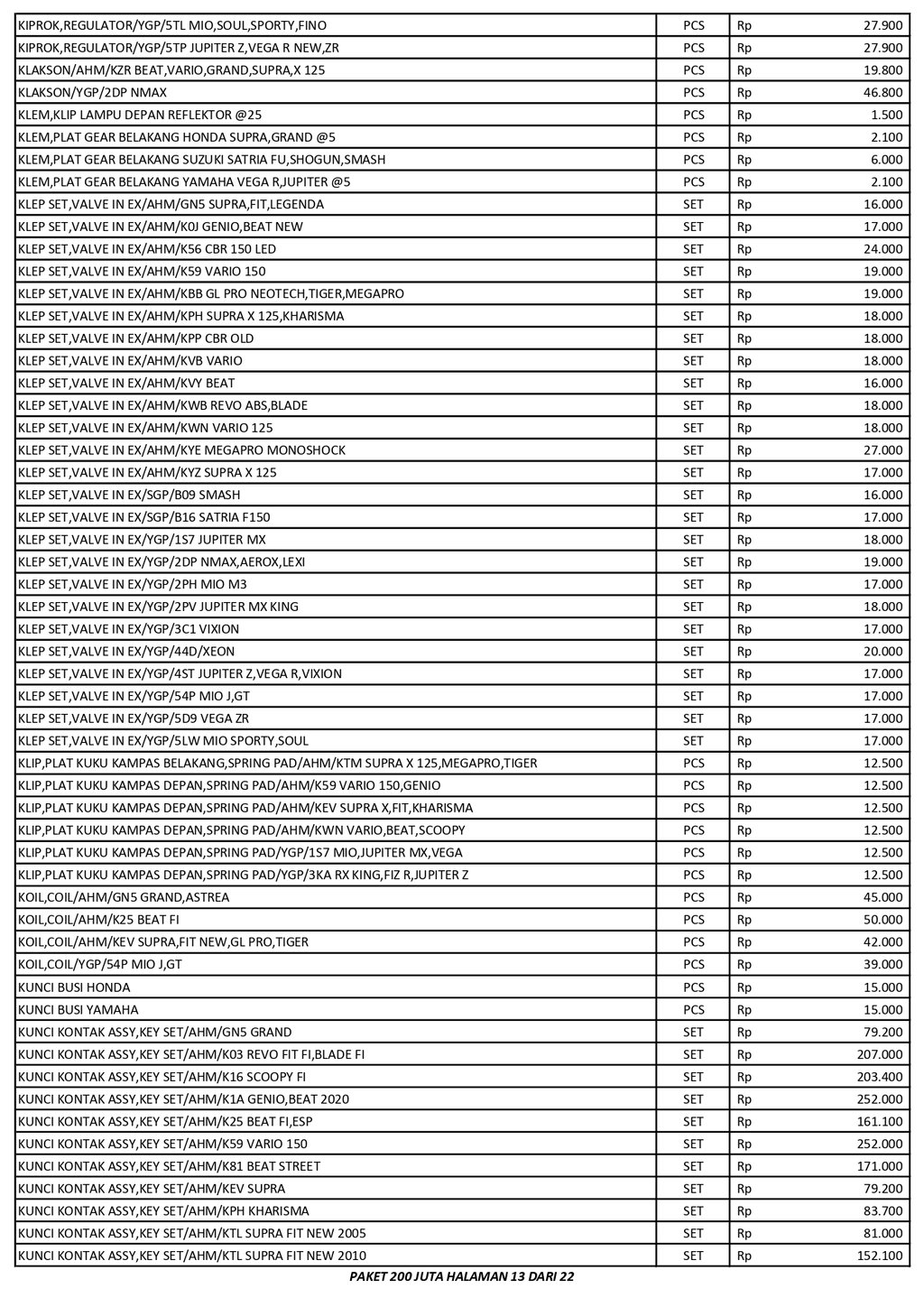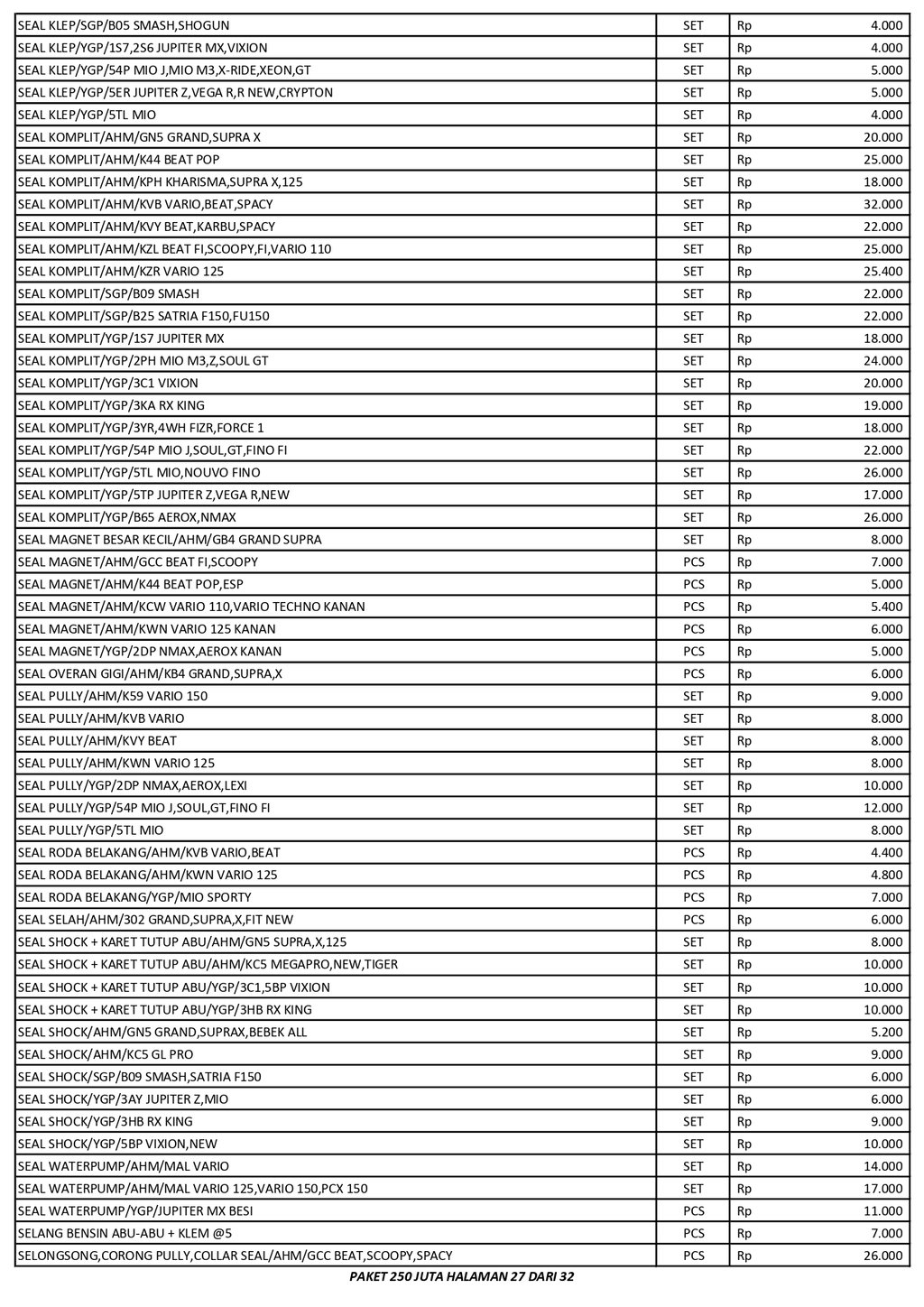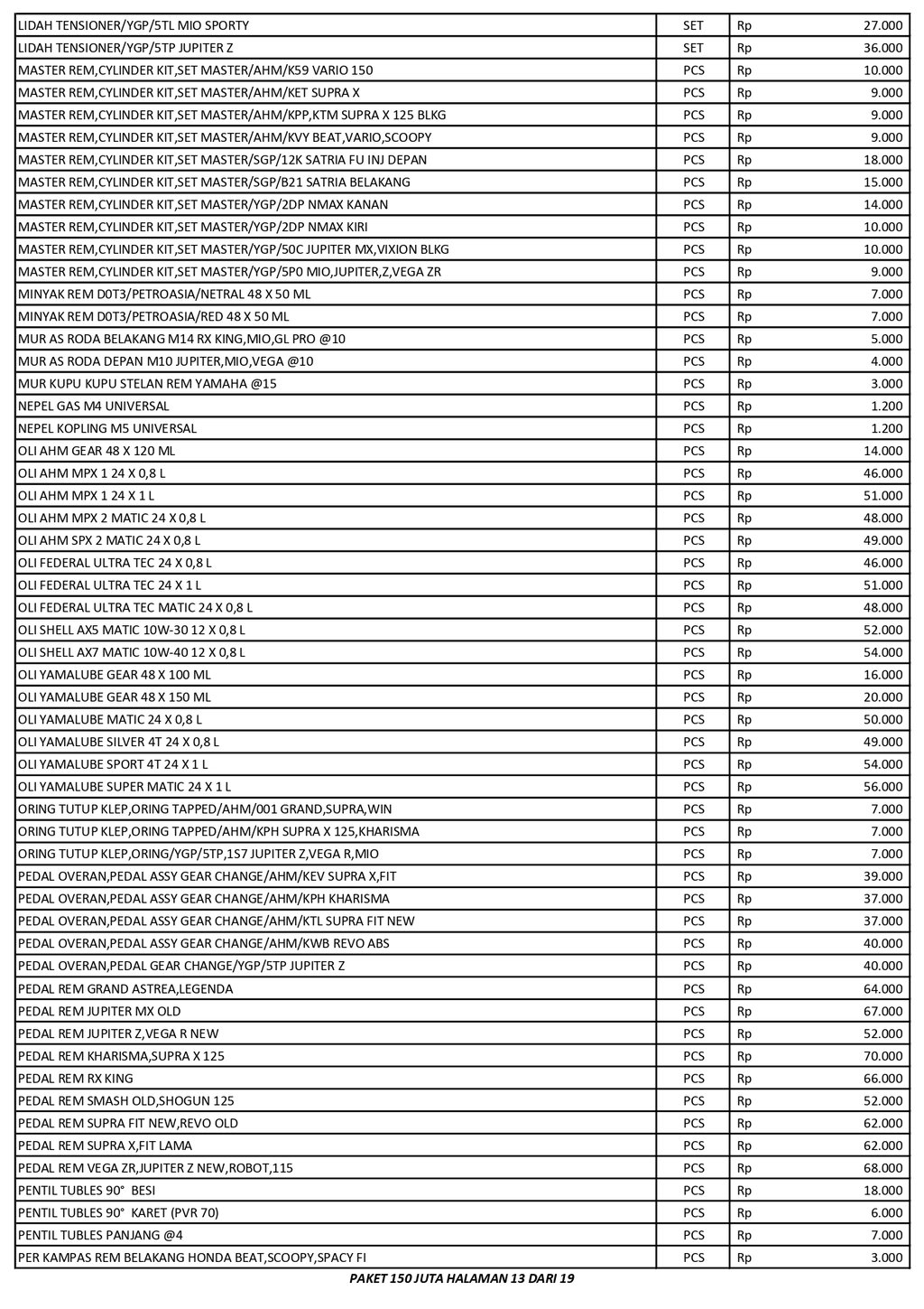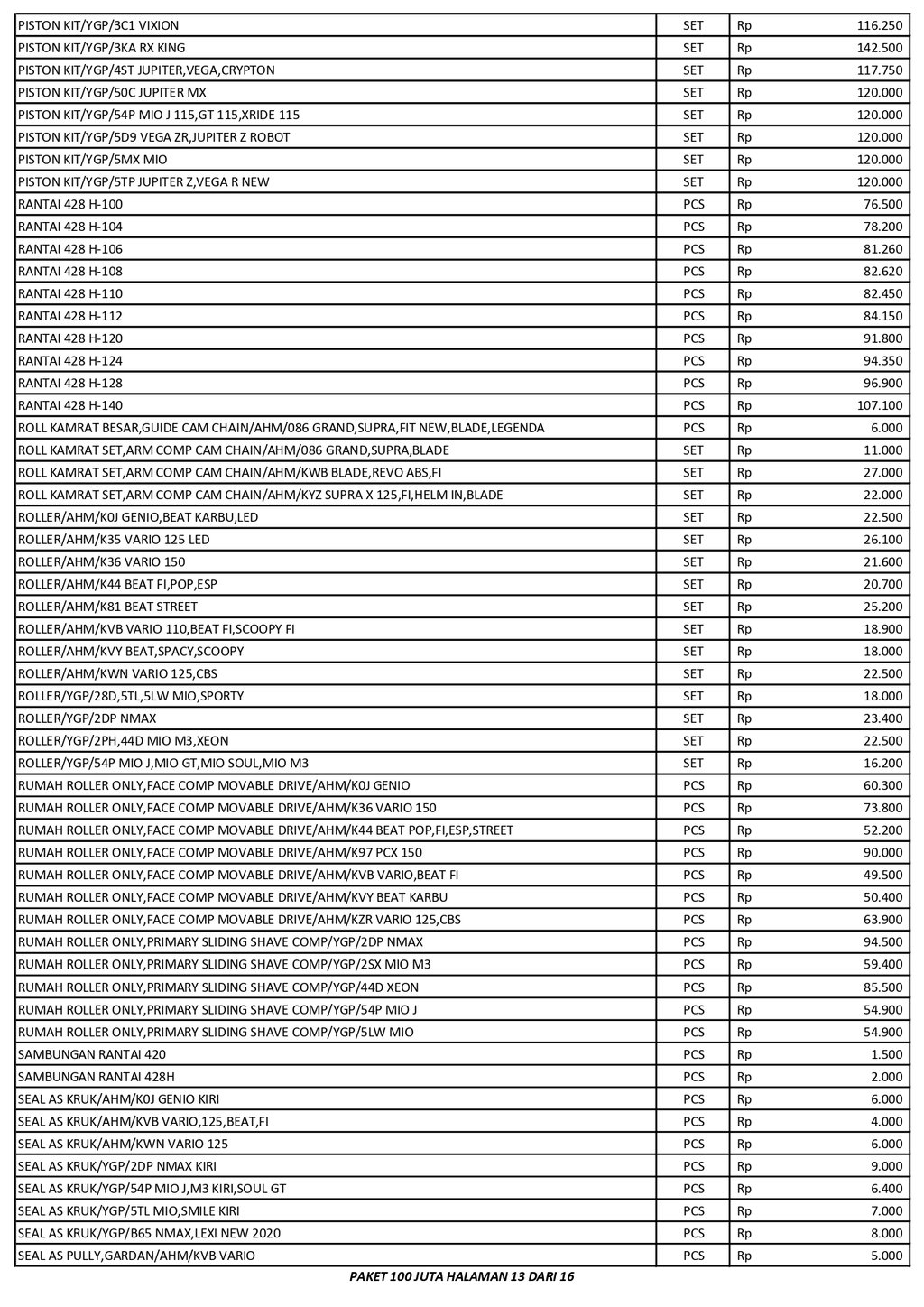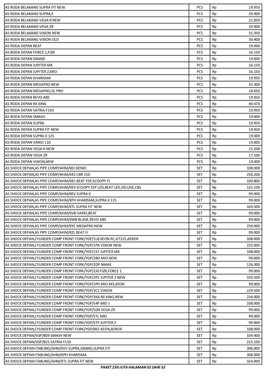 PRICELIST SPAREPART, BAN LUAR, BAN DALAM, DAN OLI