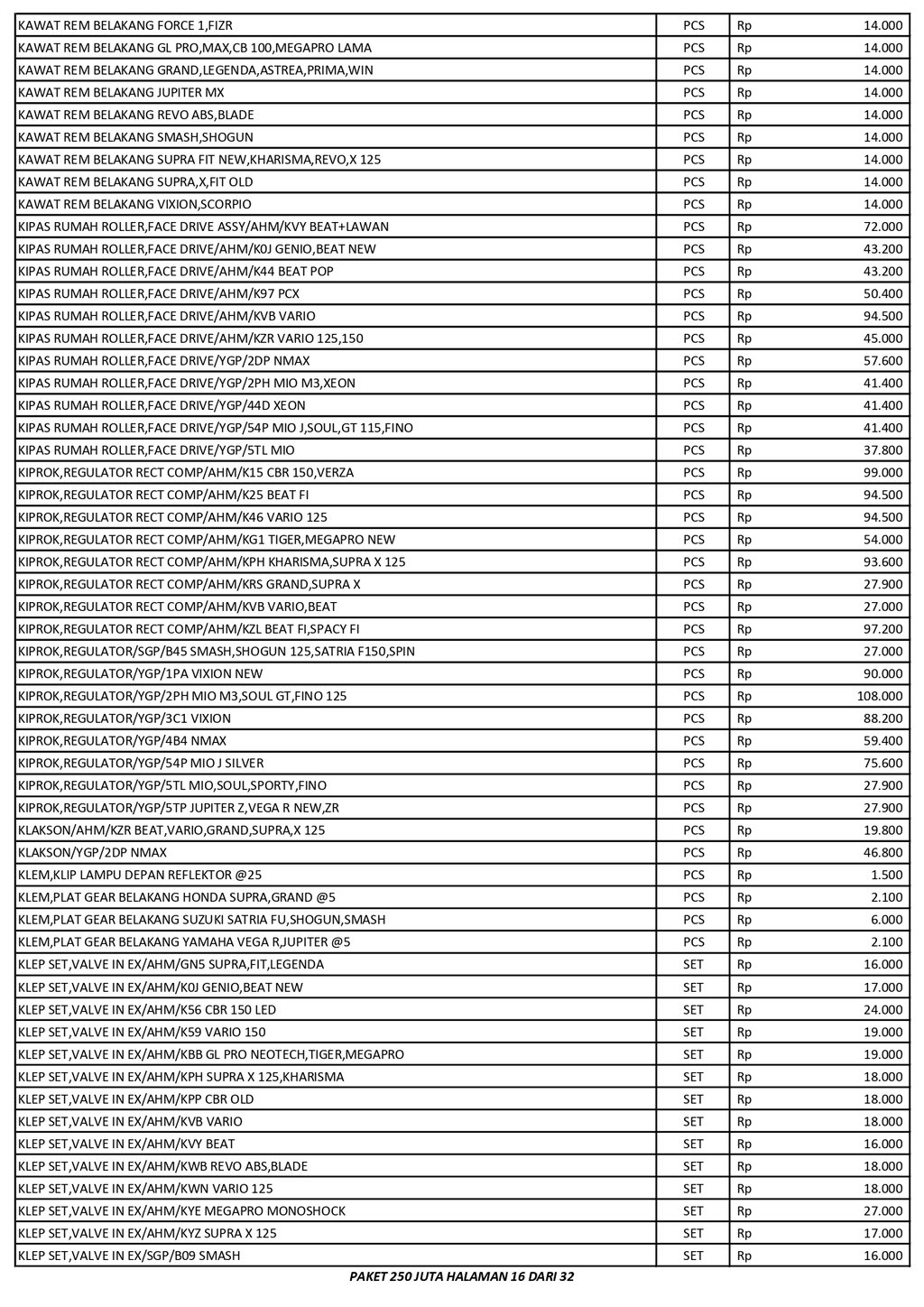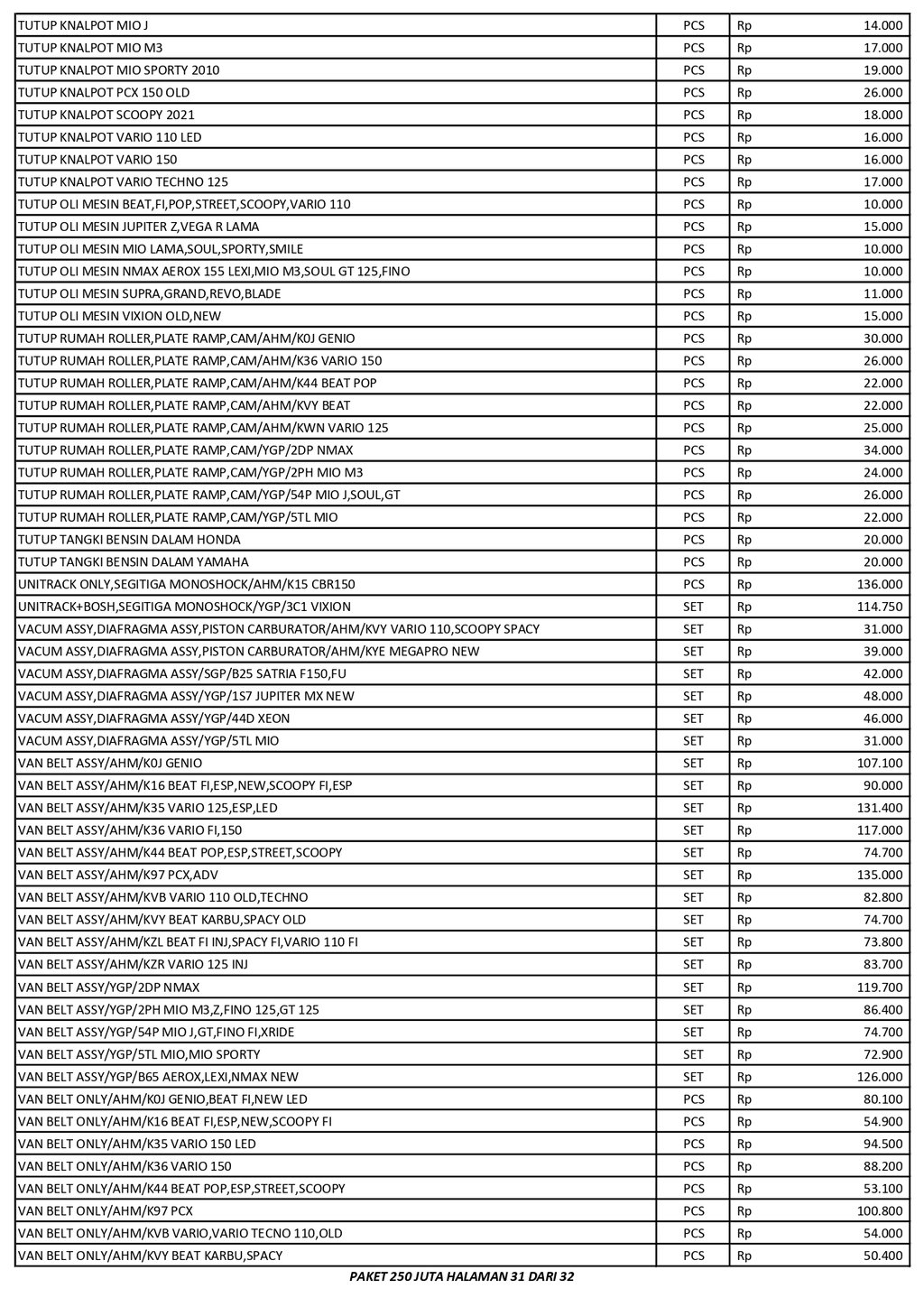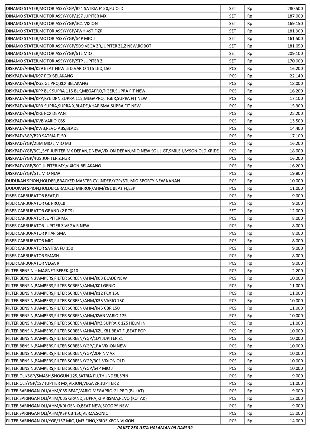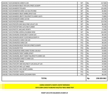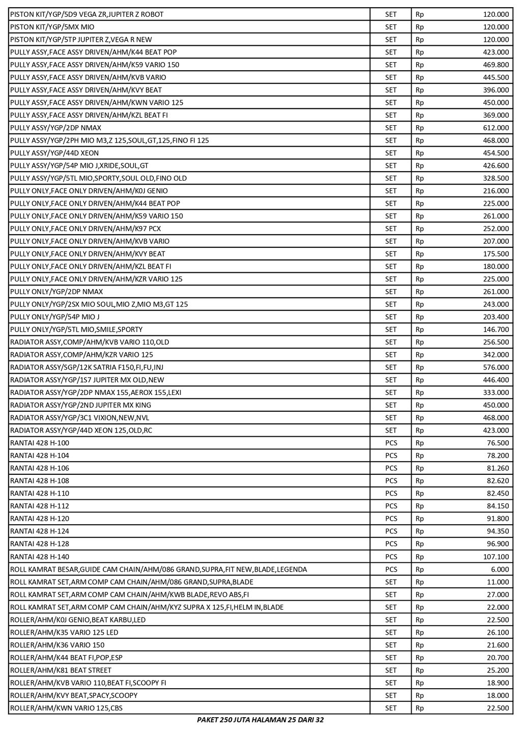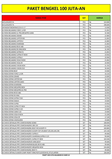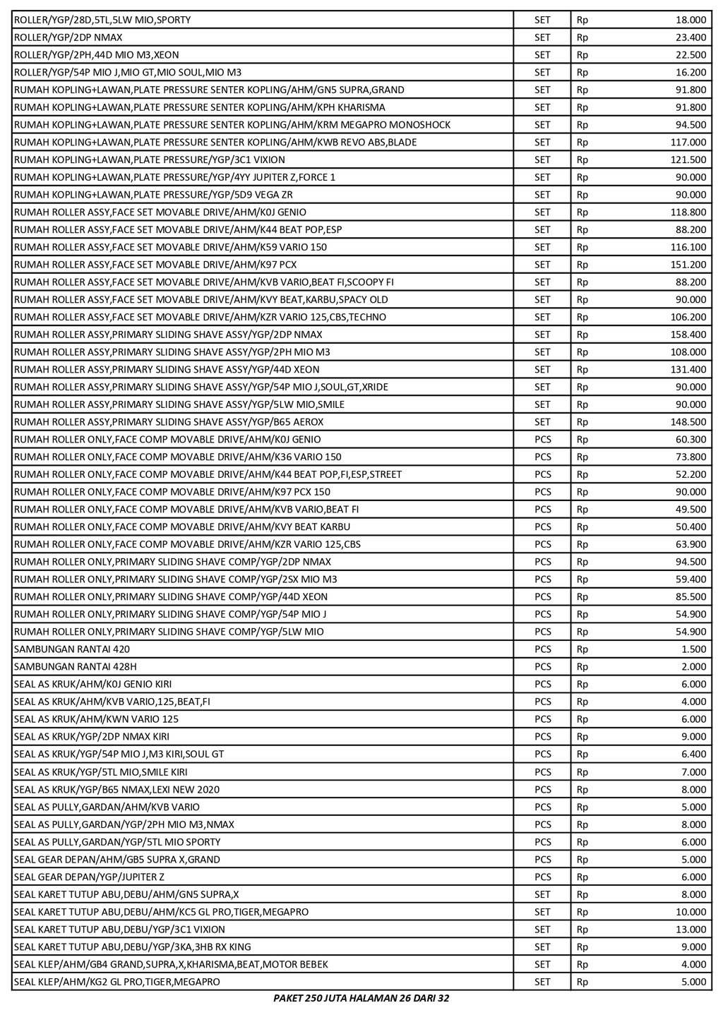 PRICELIST SPAREPART, BAN LUAR, BAN DALAM, DAN OLI