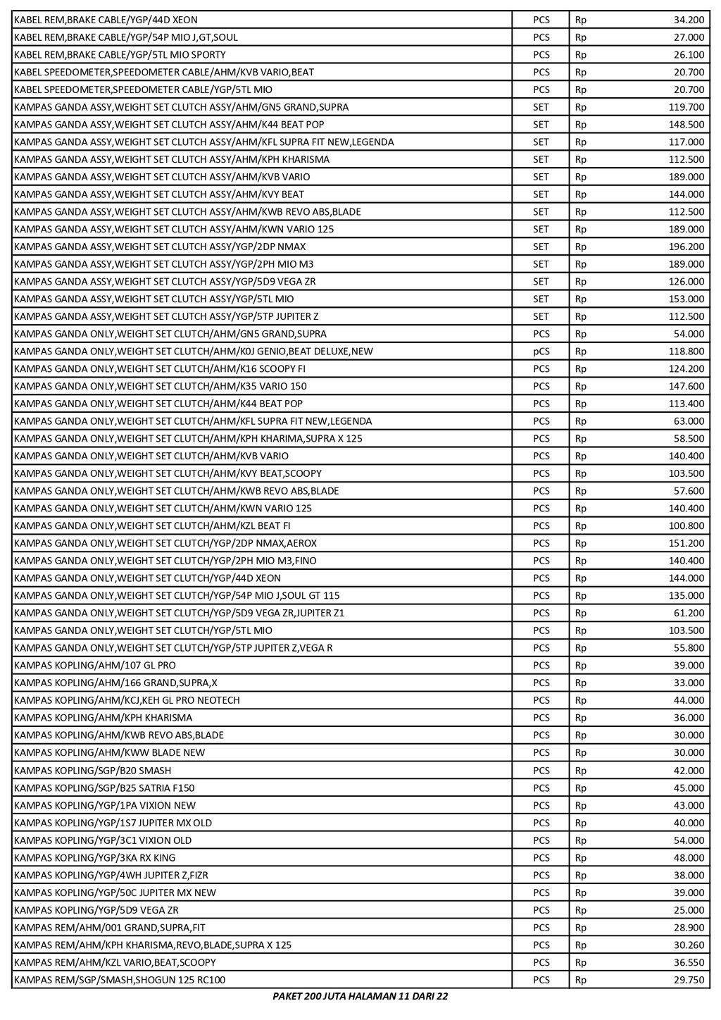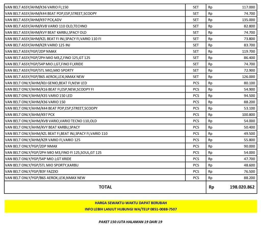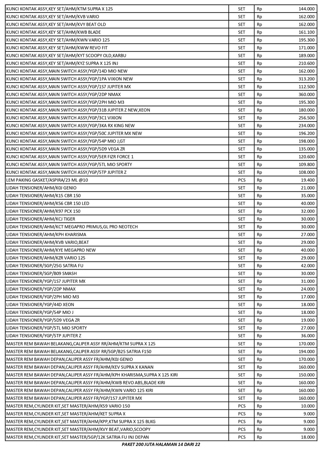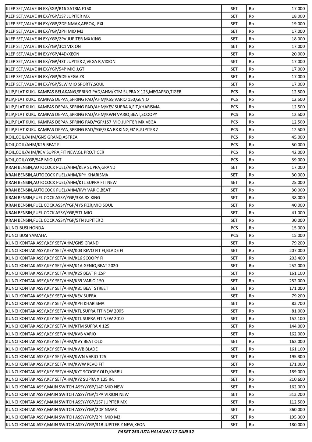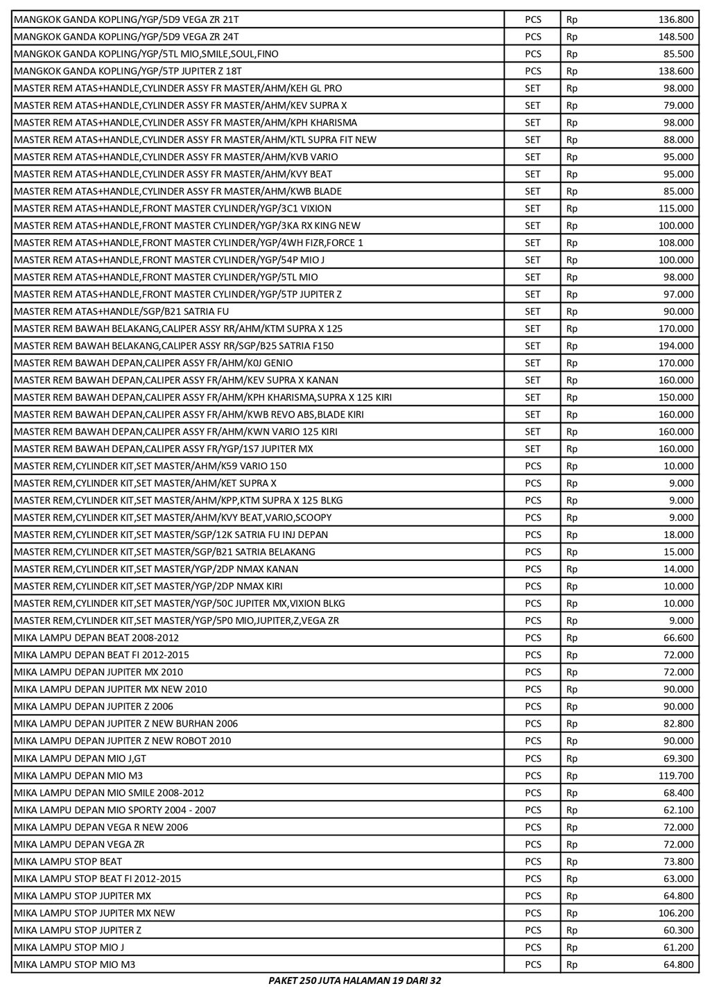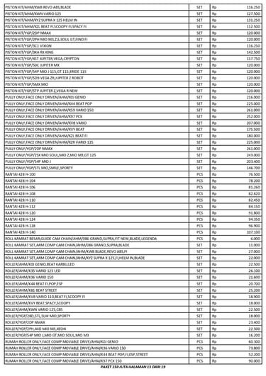 PRICELIST SPAREPART, BAN LUAR, BAN DALAM, DAN OLI