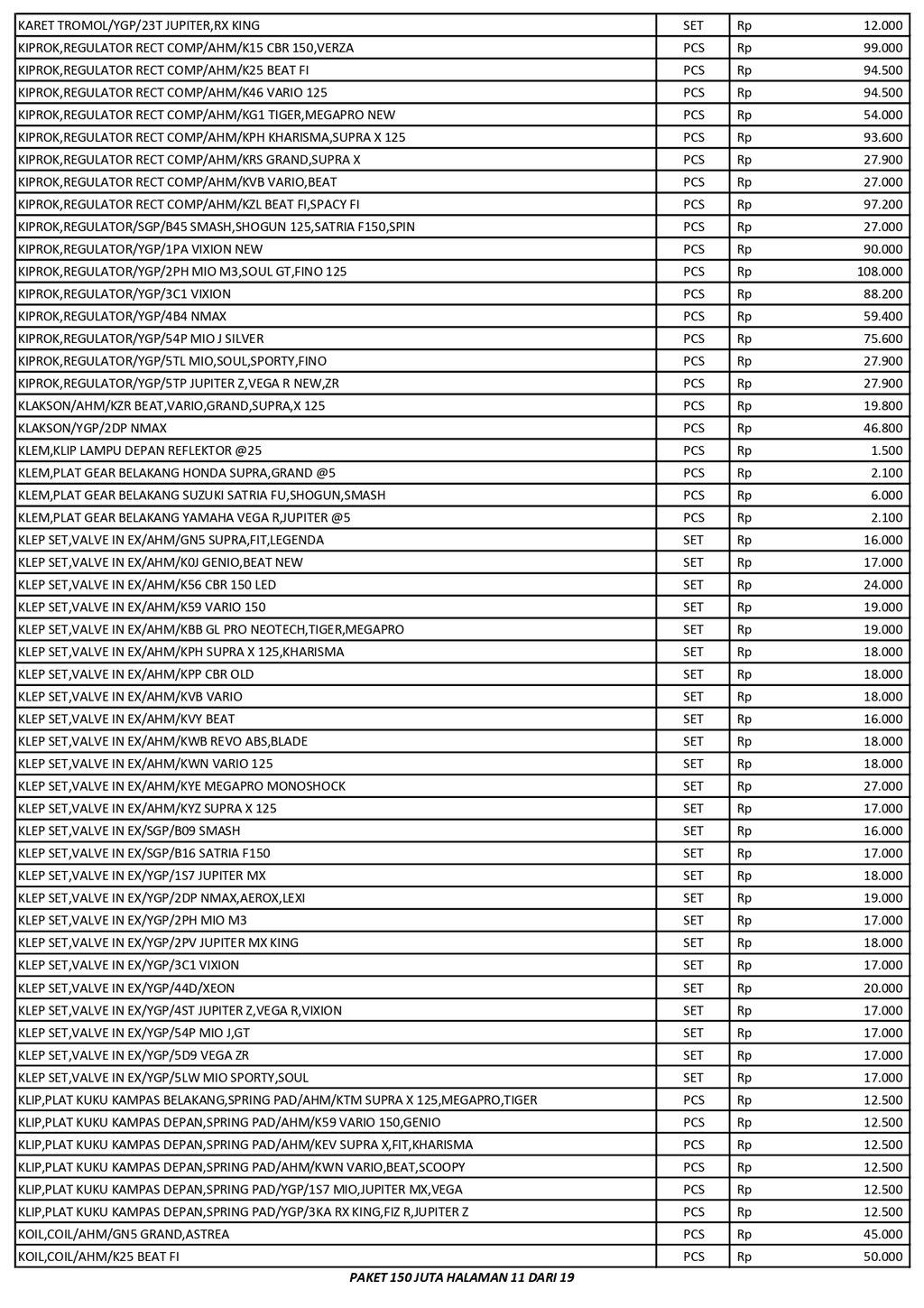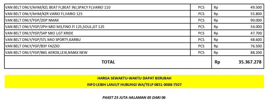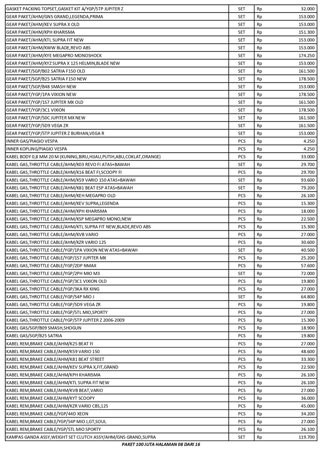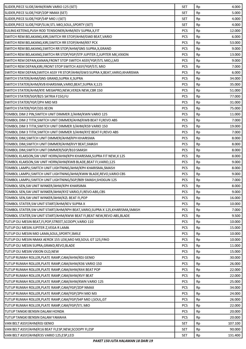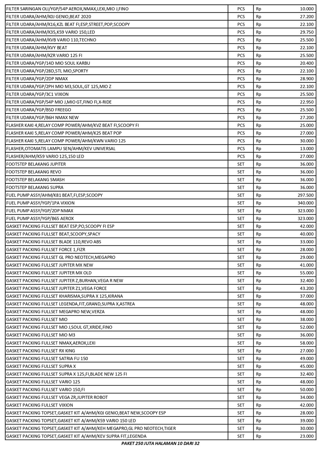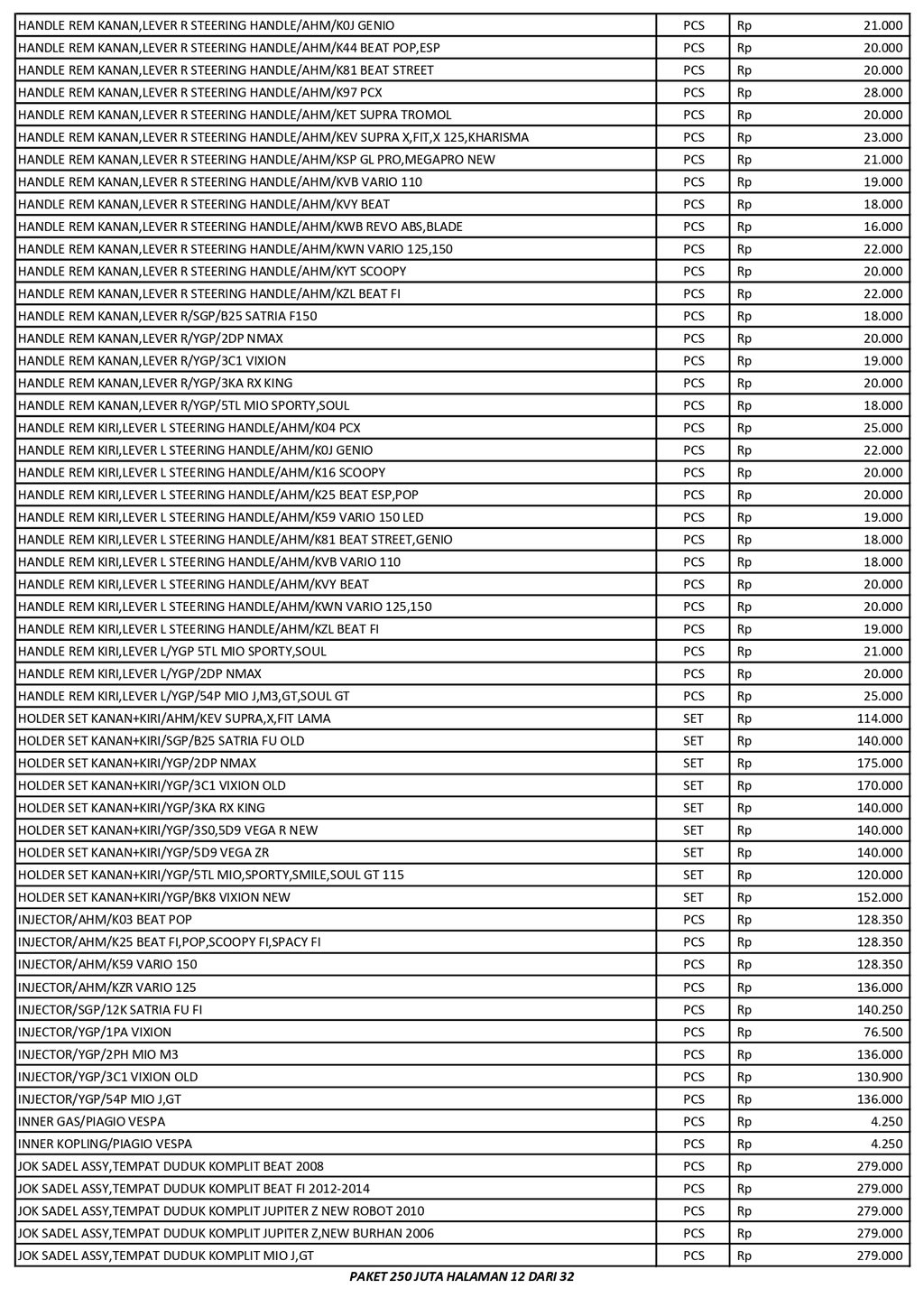 PRICELIST SPAREPART, BAN LUAR, BAN DALAM, DAN OLI