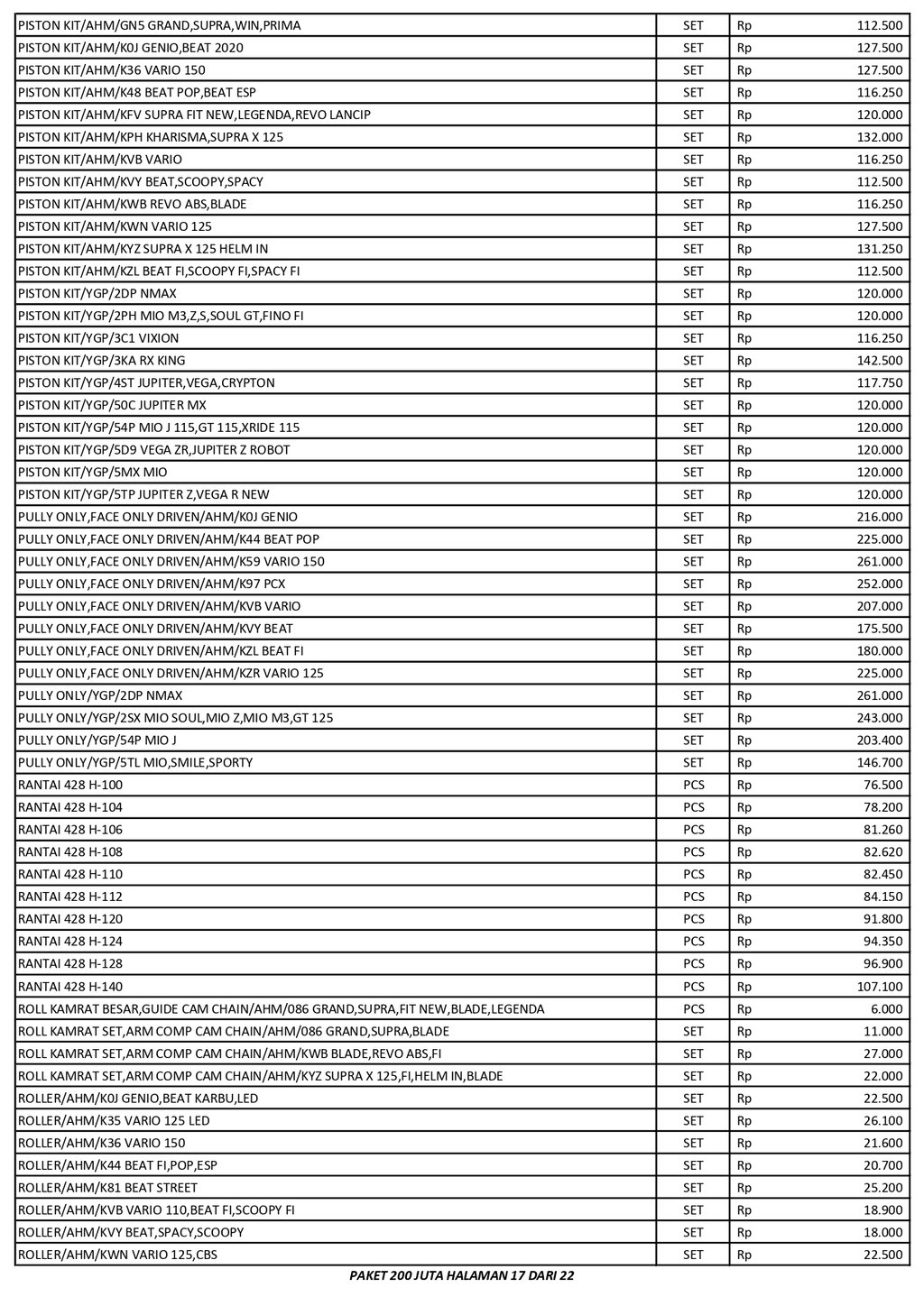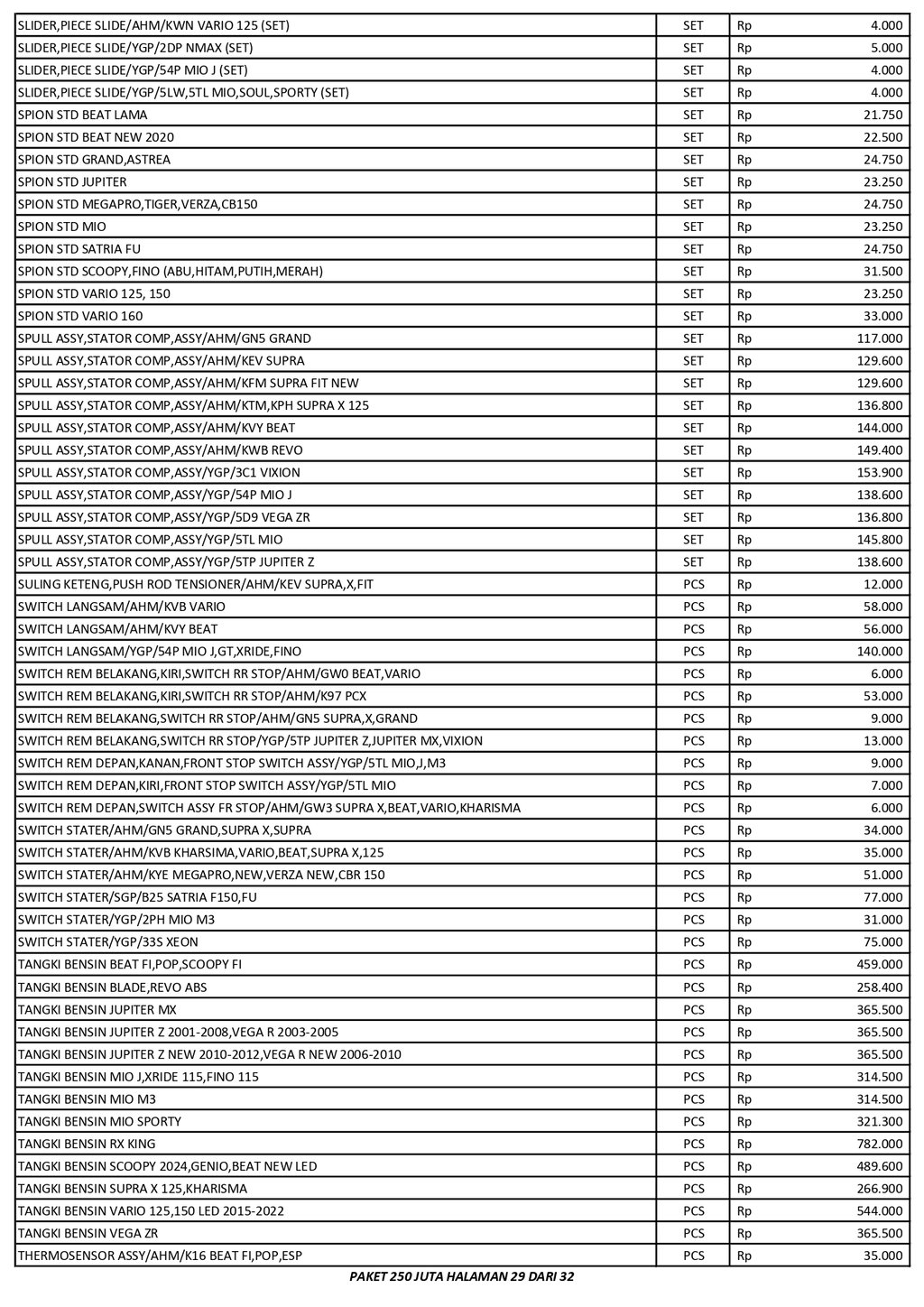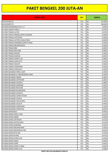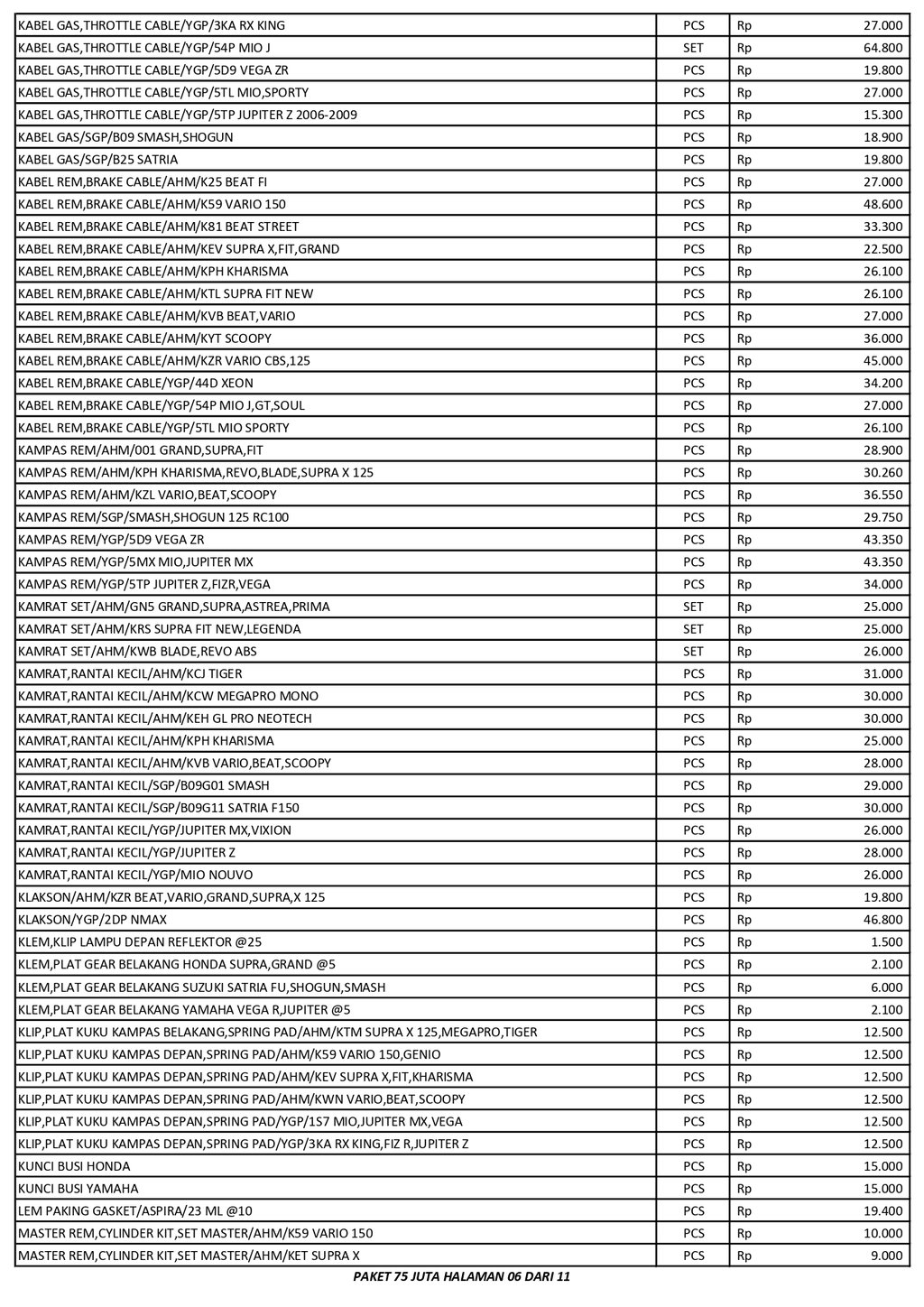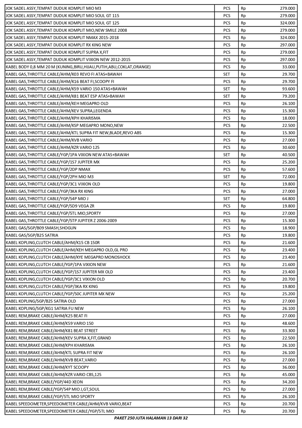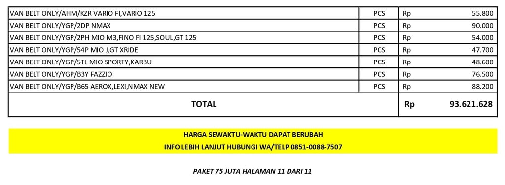 PRICELIST SPAREPART, BAN LUAR, BAN DALAM, DAN OLI
