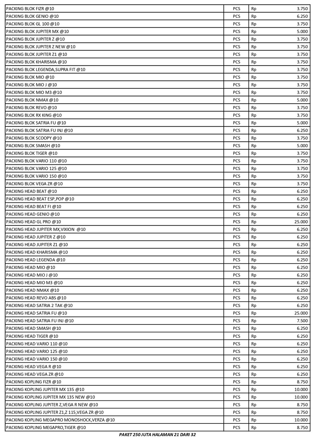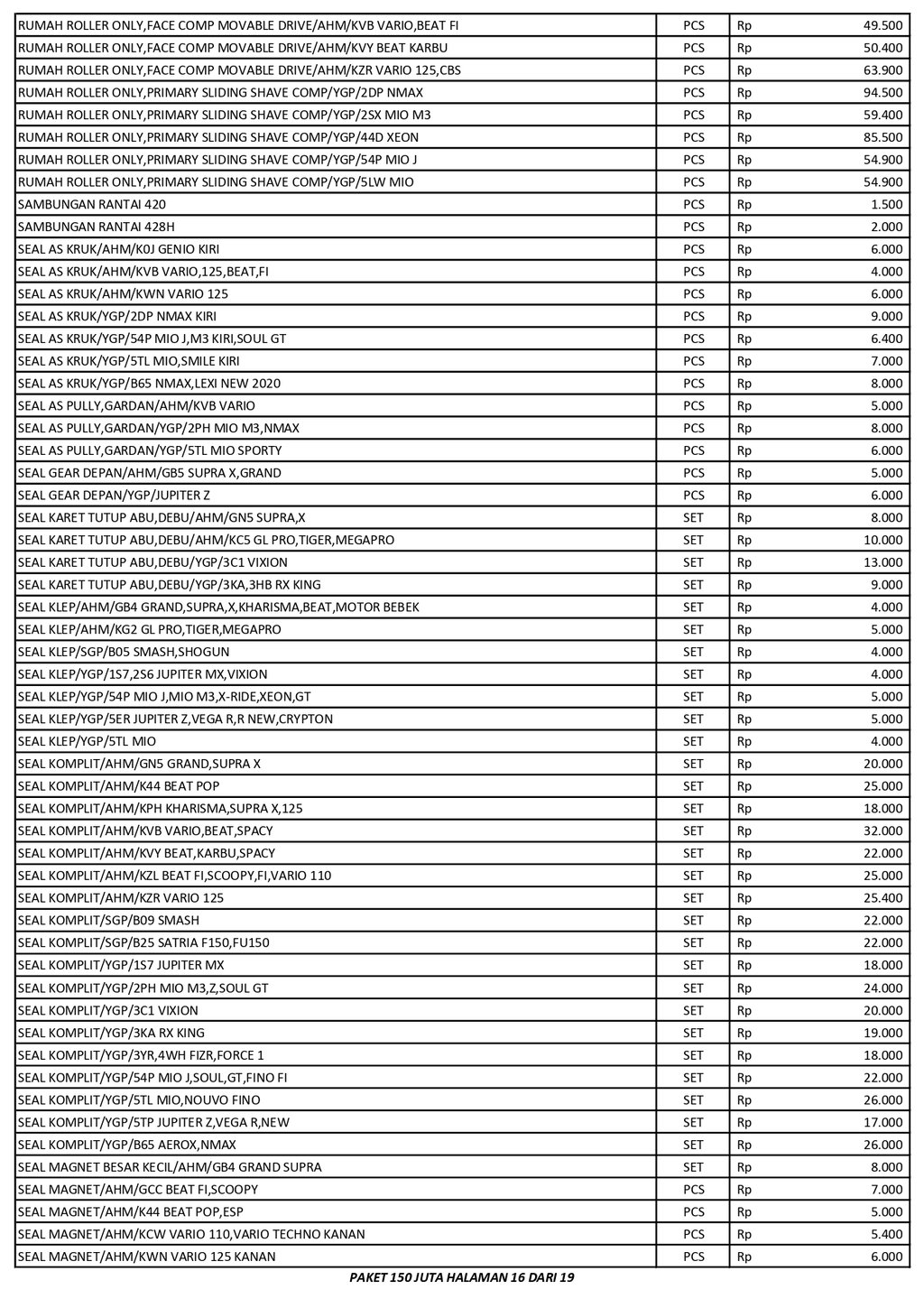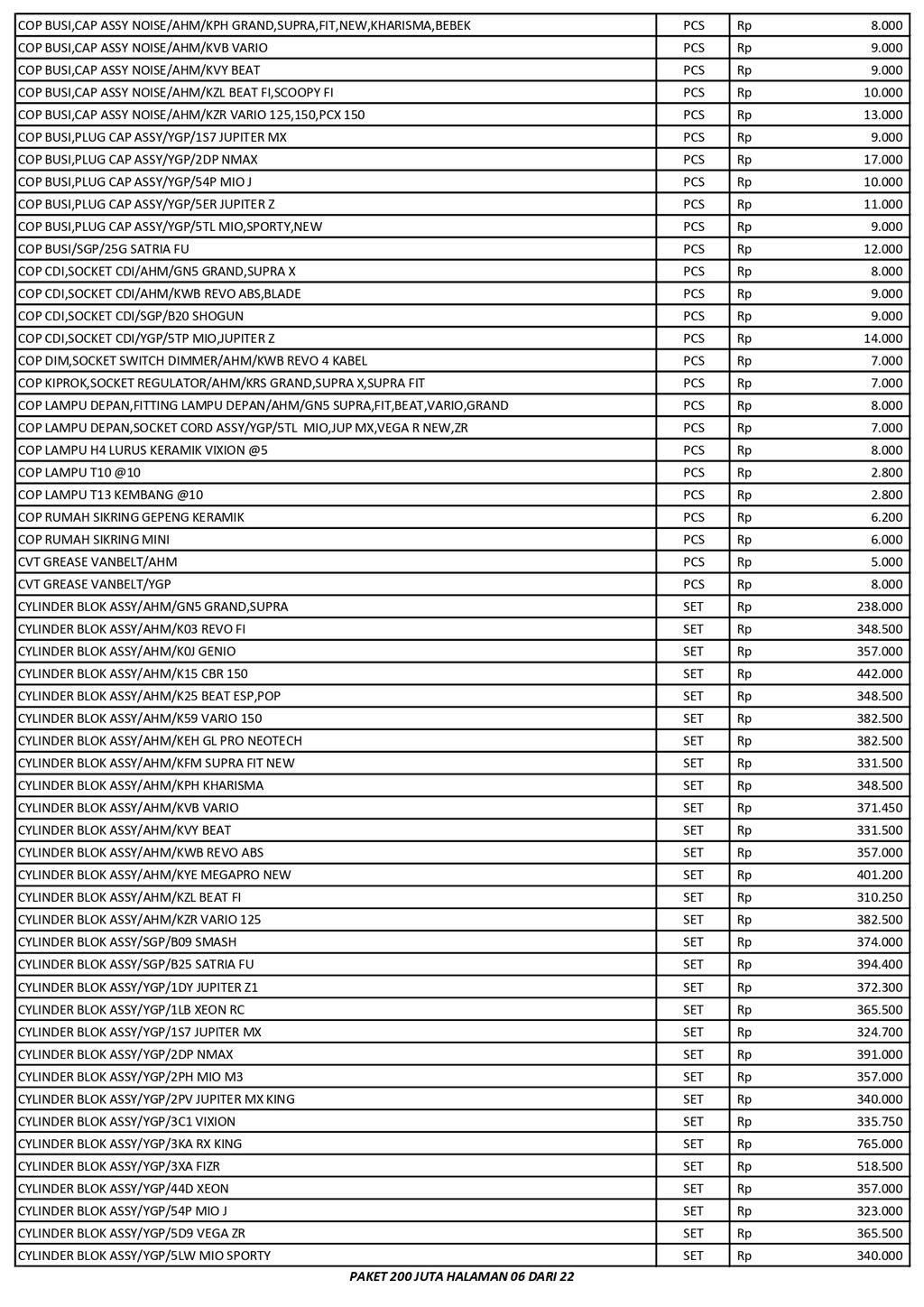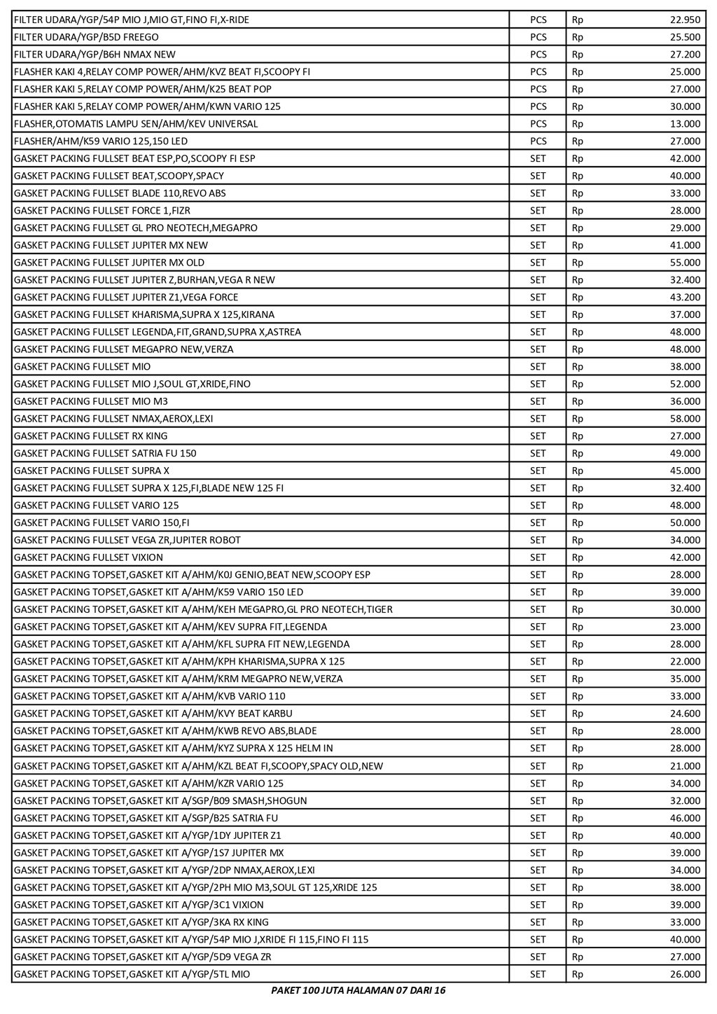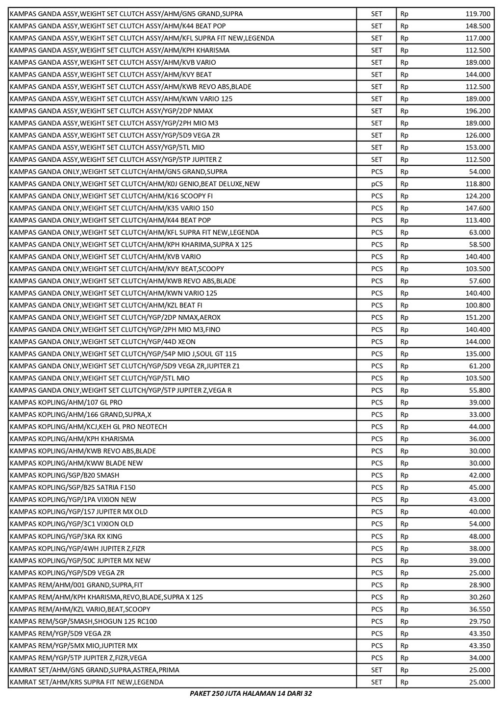 PRICELIST SPAREPART, BAN LUAR, BAN DALAM, DAN OLI
