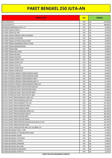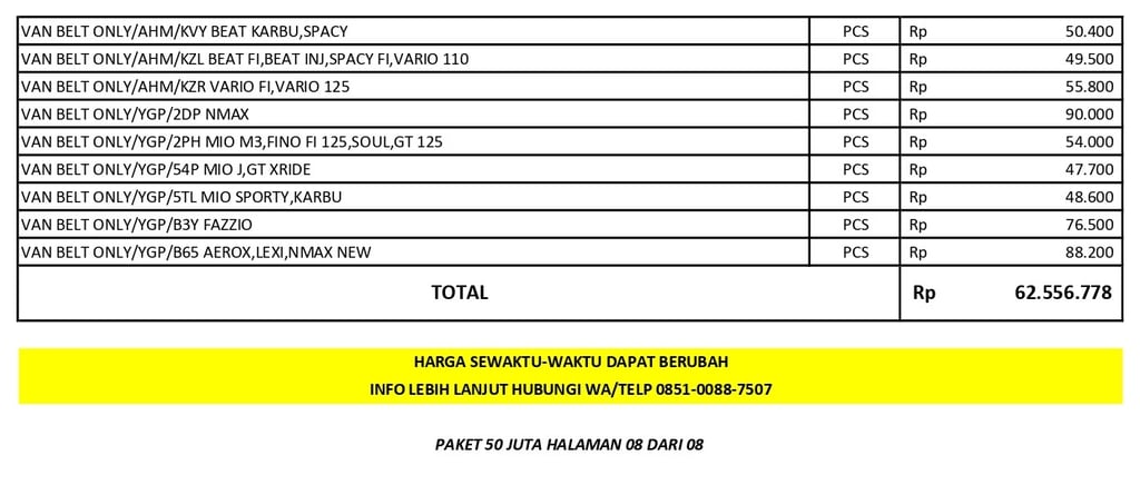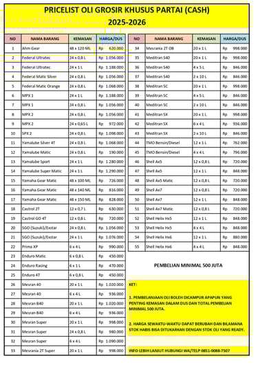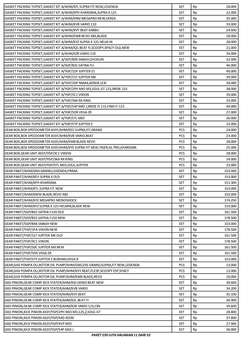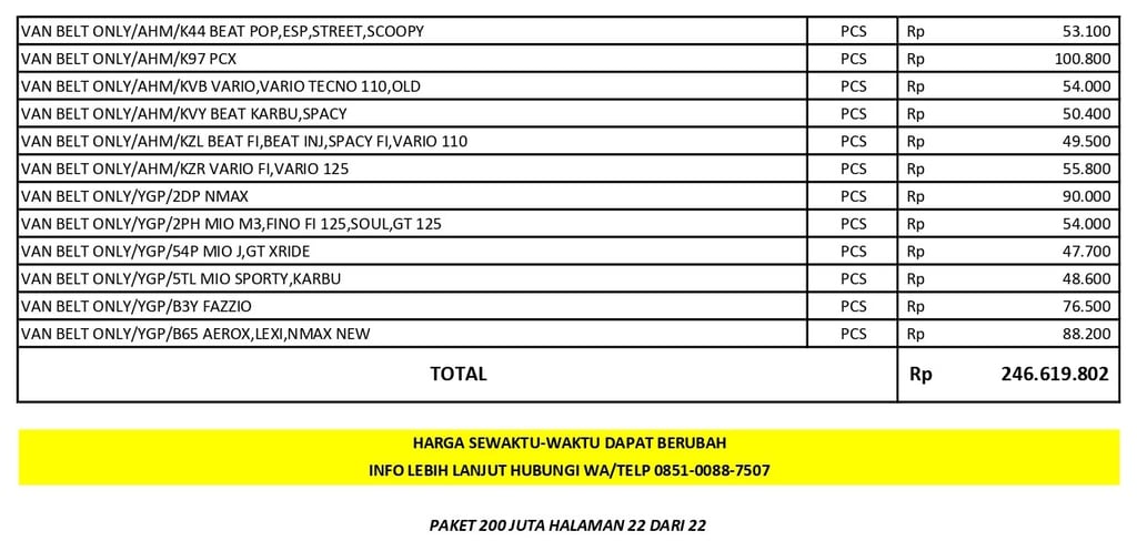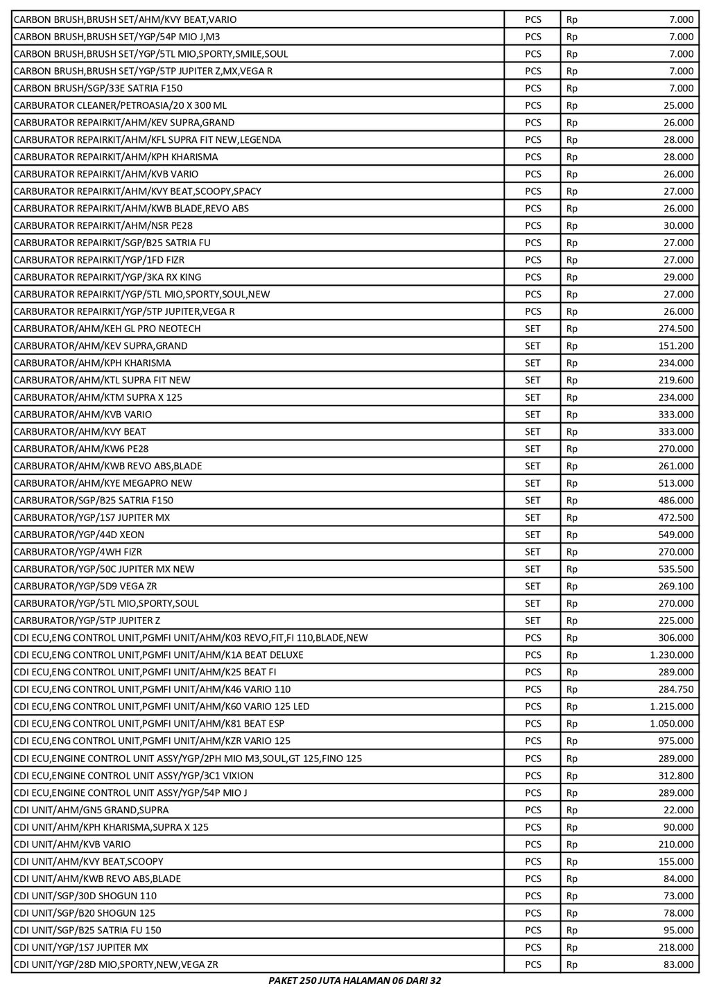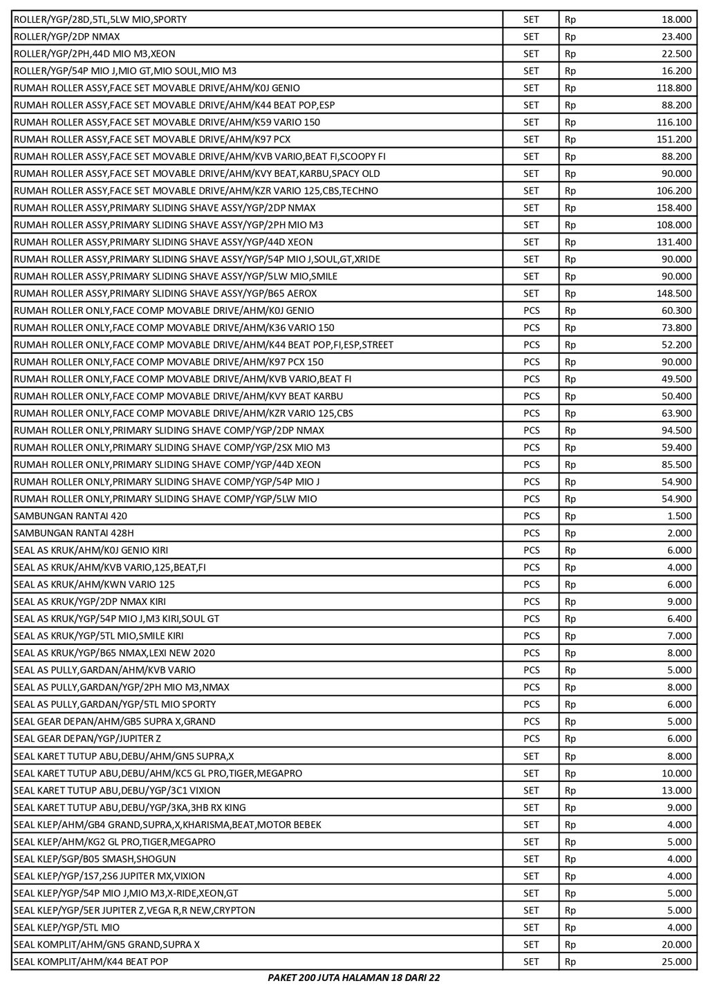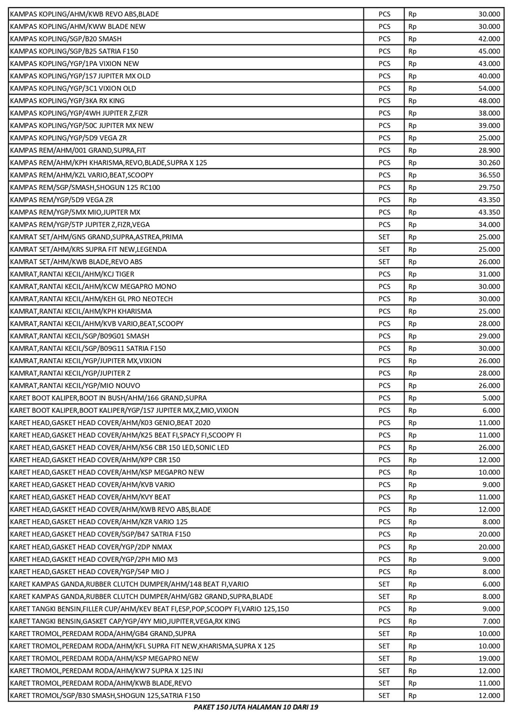 PRICELIST SPAREPART, BAN LUAR, BAN DALAM, DAN OLI